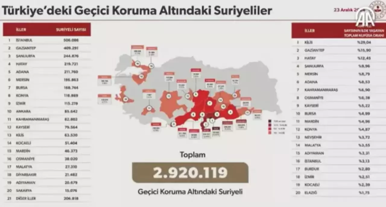 İçişleri Bakanı Ali Yerlikaya, Anadolu Ajansı Editör Masası programında Türkiye'deki Suriyelilere ilişkin önemli veriler paylaştı. Ülkede toplamda 4 milyon 164 bin yasal göçmen bulunduğunu belirten Yerlikaya, bunların 2 milyon 920 bininin Suriyeli olduğunu ifade etti.
