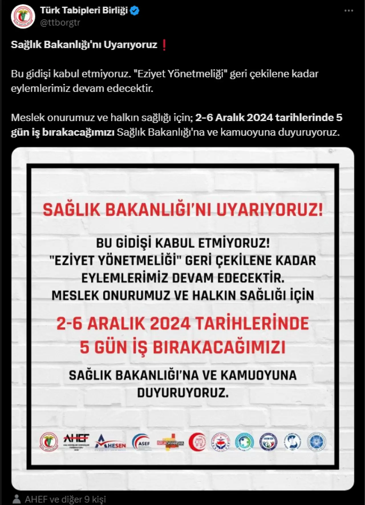 TTB'nin açıklamasında, "Sağlık Bakanlığı'nı uyarıyoruz. Bu gidişi kabul etmiyoruz. 'Eziyet Yönetmeliği' geri çekilene kadar eylemlerimiz devam edecektir. Meslek onurumuz ve halkın sağlığı için; 2-6 Aralık 2024 tarihlerinde 5 gün iş bırakacağımızı Sağlık Bakanlığı'na ve kamuoyuna duyuruyoruz," ifadeleri yer aldı.