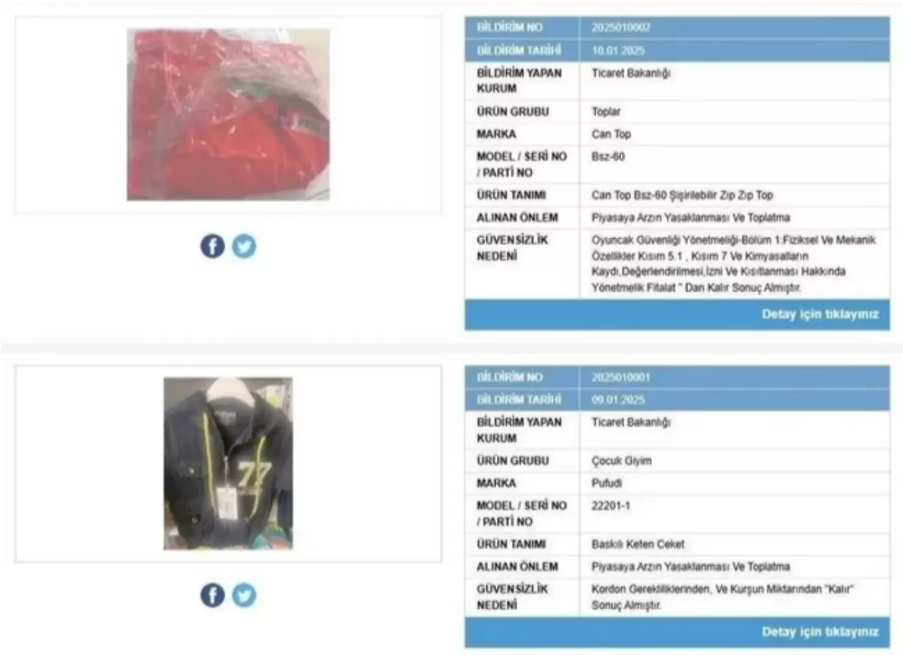 04.02.2025 tarihli bildirime göre, piyasadan çekilen ürünler arasında sadece bebek kıyafetleri değil, çeşitli oyuncaklar da bulunuyor. Daha önce güvensiz olduğu tespit edilerek toplatılan ürünler şunlar: