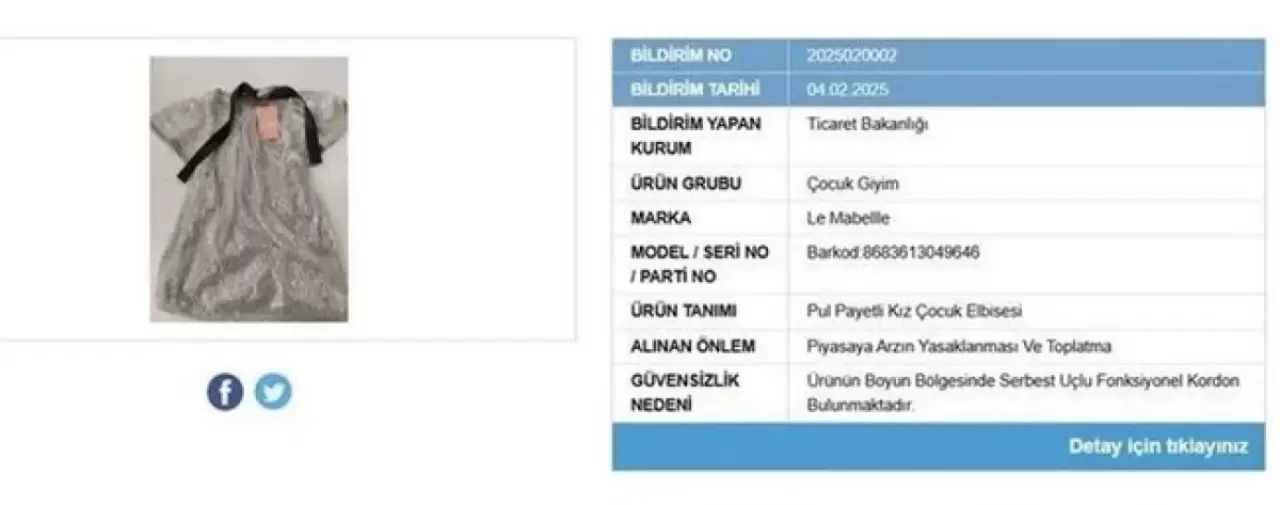 Ticaret Bakanlığı, çocuk sağlığını tehdit eden bir bebek giysisini güvensiz bularak piyasadan toplatma kararı aldı.