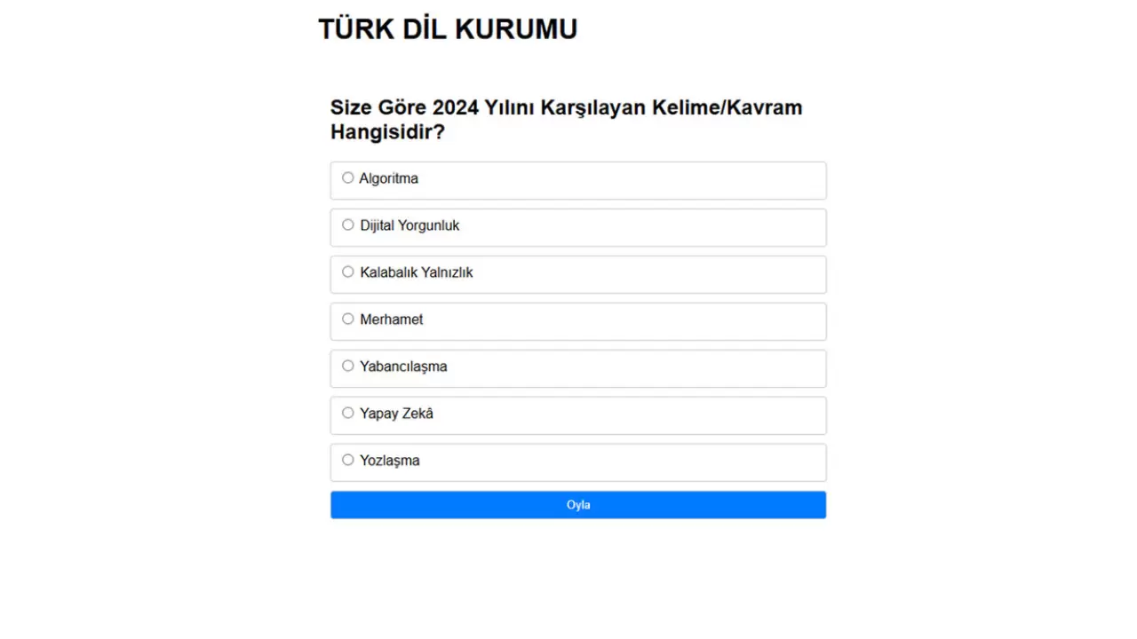 Siz de bu ankete katılarak 2024 yılının öne çıkan kelimesi ya da kavramını belirlemede rol oynayabilirsiniz. TDK'ın resmi internet sitesinden ulaşabileceğiniz anket, halkın şahsi ve toplumsal görüşlerini özgürce dile getirebilmesini sağlıyor.