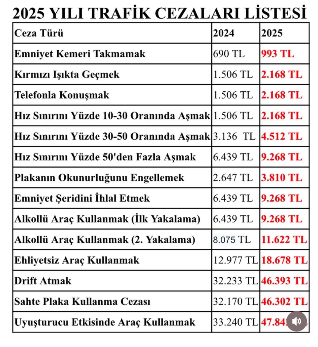 - Emniyet Kemeri Takmamak: 2024 yılında 690 TL olan ceza, 2025'te %44 artışla 993 TL oldu.
