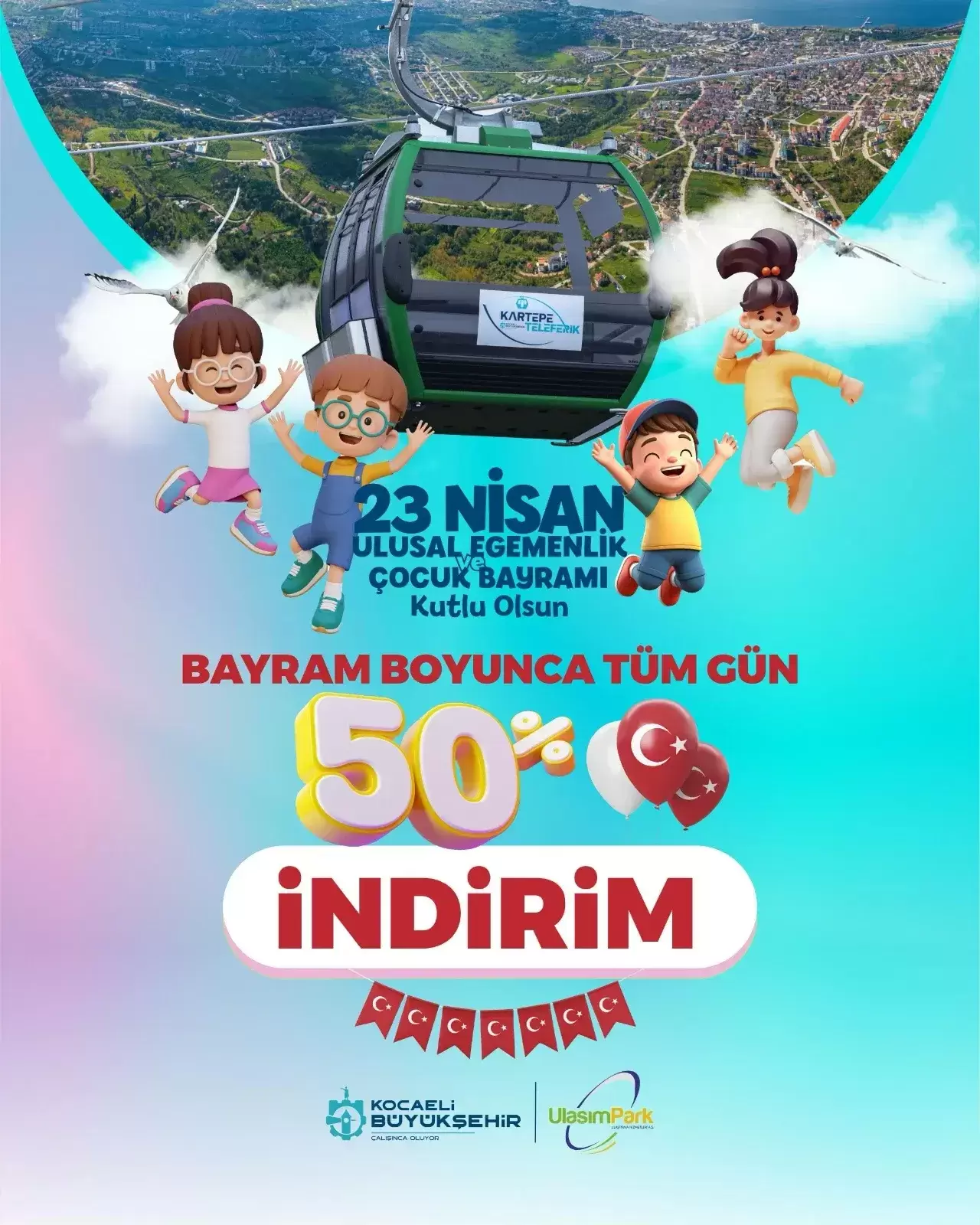 Kocaeli Büyükşehir Belediyesi, 23 Nisan Ulusal Egemenlik ve Çocuk Bayramı'nı kutlamak için Kartepe Teleferik’te özel bir indirim fırsatı sunuyor. Bayram coşkusuna renk katmak amacıyla, Kartepe Teleferik hattında tüm gün geçerli olmak üzere biletlerde %50 indirim uygulanacak.
