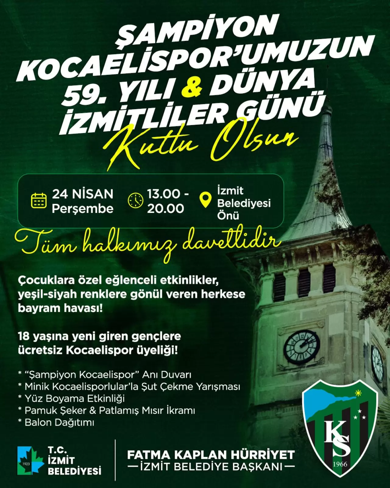 İzmit Belediyesi, bu özel günün, Kocaelispor’un 59 yıllık gururunu ve İzmitli olmanın heyecanını birlikte yaşamak için tüm vatandaşları etkinlik alanına davet ediyor. Kocaelispor sevdalıları ve İzmitliler, 24 Nisan’da İzmit Belediyesi önünde buluşarak büyük bir coşku içinde kutlamaları gerçekleştirecek.
