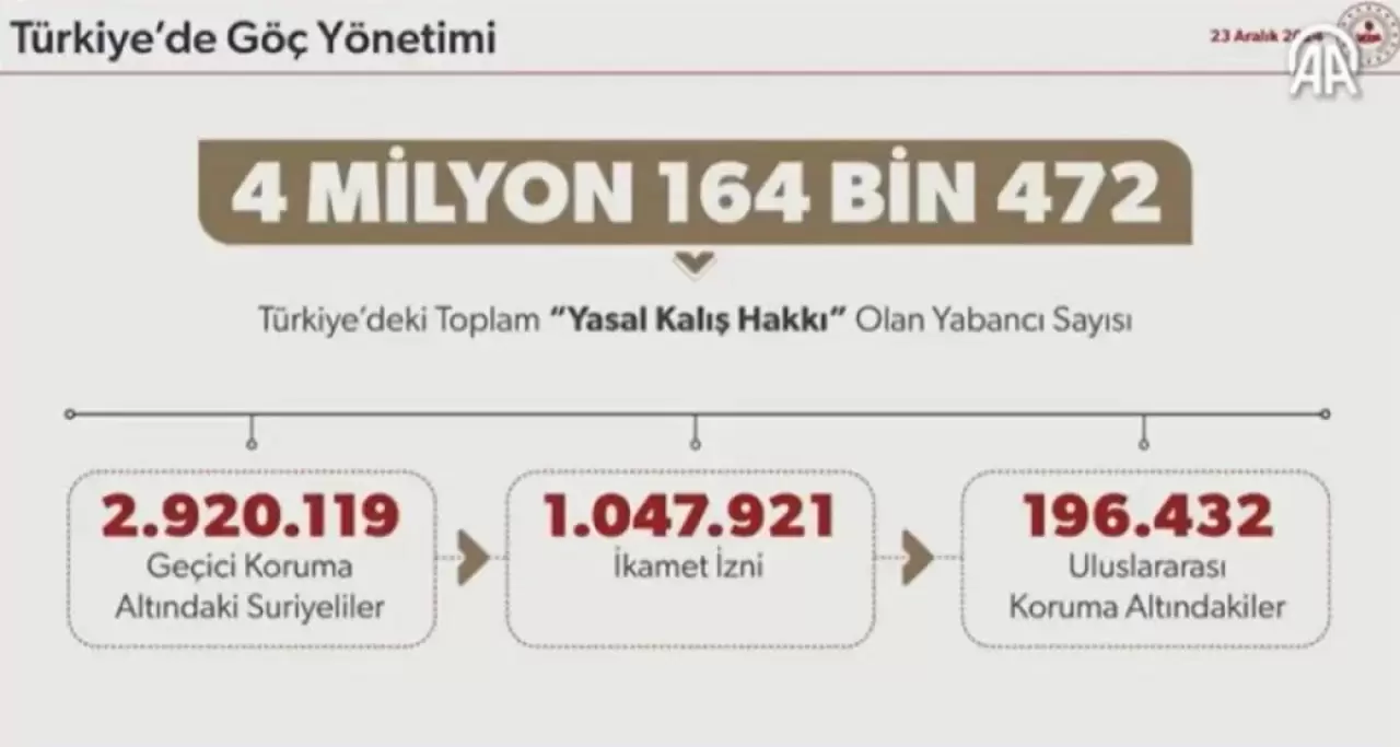 İçişleri Bakanı Ali Yerlikaya, Anadolu Ajansı Editör Masası programında Türkiye'deki Suriyelilere ilişkin önemli veriler paylaştı. Ülkede toplamda 4 milyon 164 bin yasal göçmen bulunduğunu belirten Yerlikaya, bunların 2 milyon 920 bininin Suriyeli olduğunu ifade etti.