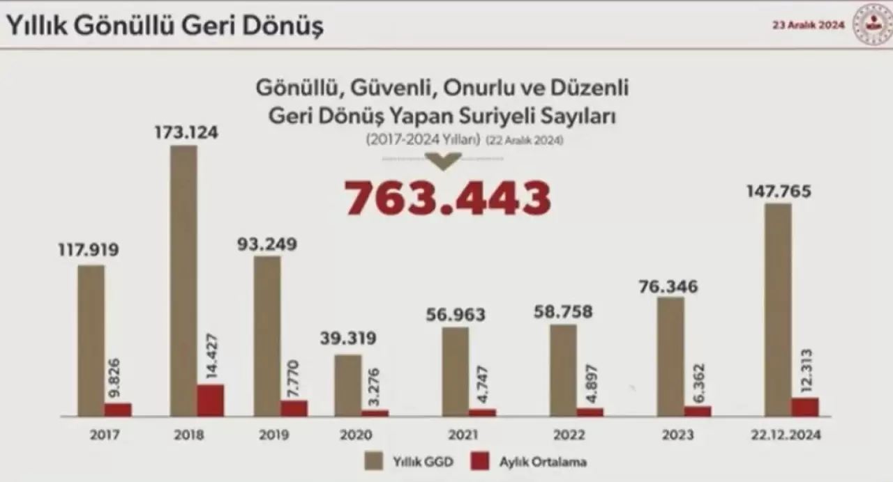Yerlikaya, 2017 yılından bu yana 763 bin 443 Suriyelinin gönüllü olarak ülkelerine döndüğünü açıkladı. Sadece son 15 günde 25 binin üzerinde geri dönüş olduğunu belirten Bakan, bu dönüşlerin ağırlıklı olarak Gaziantep’ten gerçekleştiğini söyledi. En fazla geri dönenlerin Halep kökenli olduğunu vurguladı.