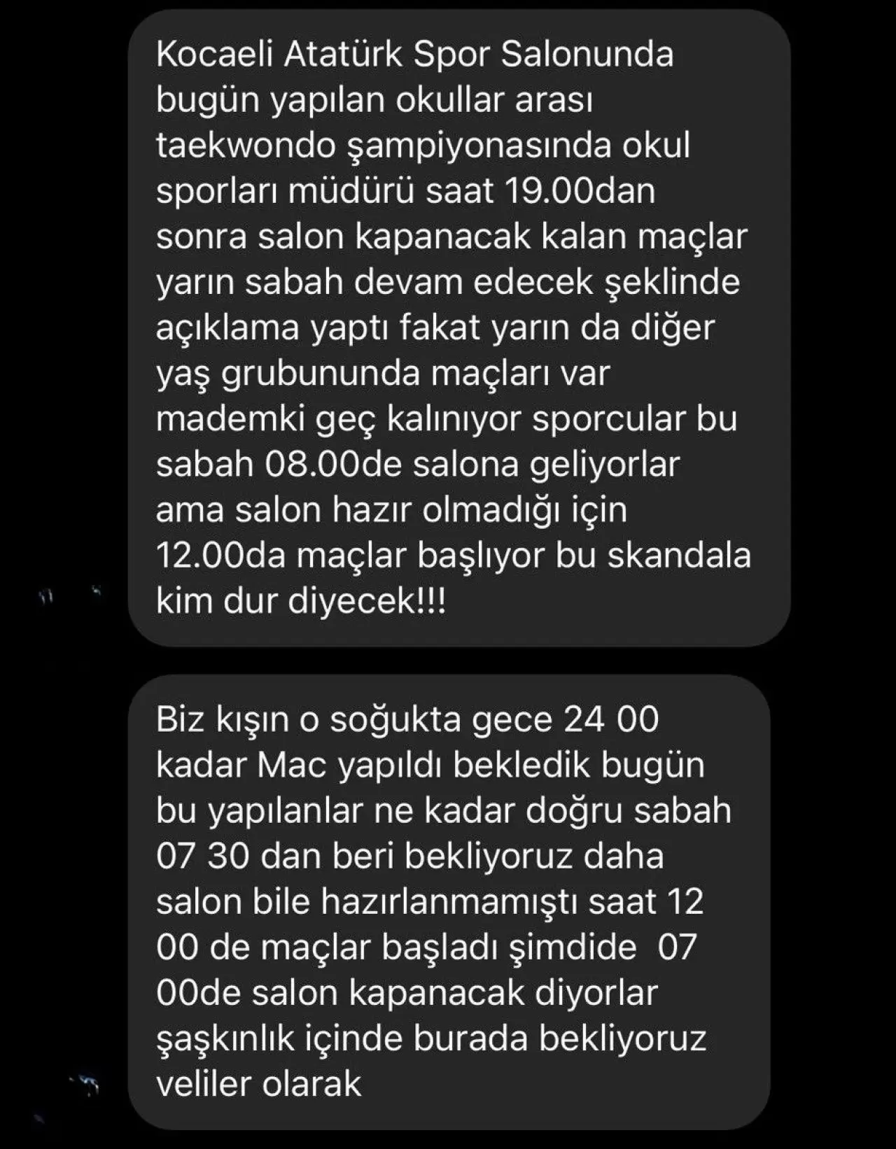 Kocaeli Atatürk Spor Salonu'nda gerçekleştirilen Okullar Arası Taekwondo Şampiyonası, organizasyon sorunları nedeniyle velilerden büyük tepki aldı. Sporcular, antrenörler ve veliler, yaşanan aksaklıklar nedeniyle isyan etti. Organizasyona dair iddialara göre, okul sporları müdürü, salonun saat 19.00'da kapatılacağını ve kalan maçların ertesi güne bırakılacağını duyurdu.