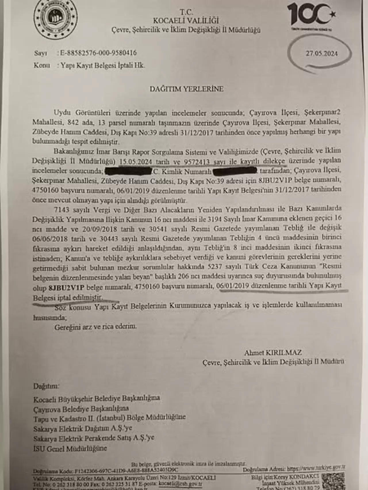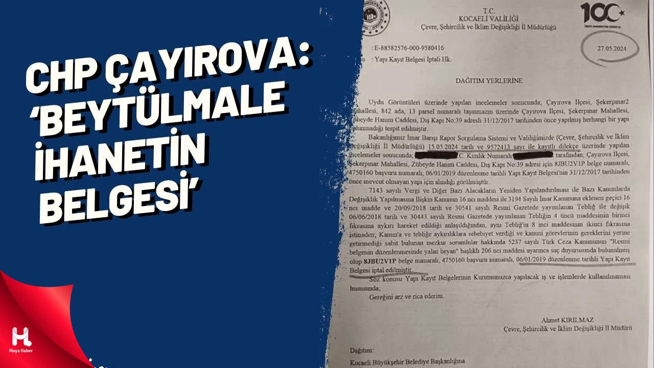 CHP’nin açıklamasına göre, 27 Mayıs 2024 tarihinde Kocaeli Valiliği Çevre, Şehircilik ve İklim Değişikliği Müdürlüğü’nden gelen yazı ile devletin malına usulsüz müdahaleler ihbar edildi. Buna rağmen, Çayırova Belediye Başkanlığı’nın bu ihbara 7 ay boyunca işlem yapmadığı iddia edildi. Üstelik yapı kayıt belgesi iptal edilmiş olmasına rağmen herhangi bir adım atılmadığı ve dosyanın rafta bekletildiği ifade edildi.