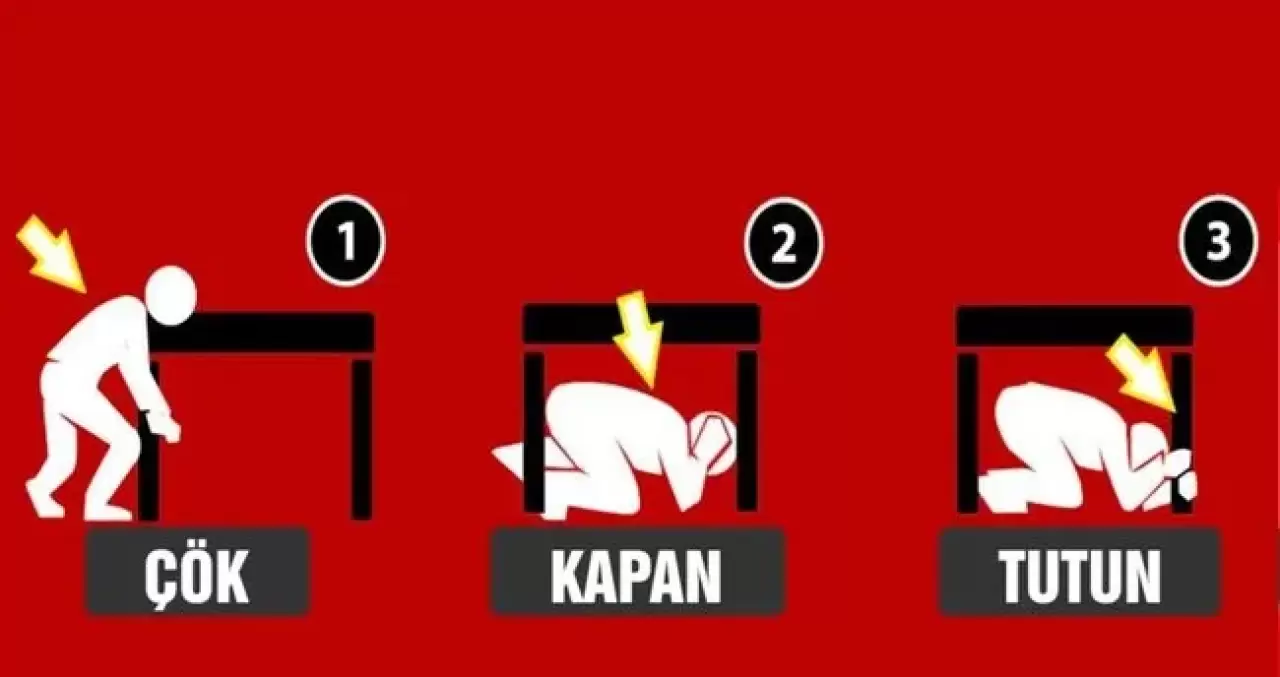 • Çök-Kapan-Tutun Pozisyonu: Güvenli bir yer bulun, dizlerinizin üzerine çökün, başınızı ve boynunuzu korumak için ellerinizle kapanın ve sabit bir eşyaya tutunun.