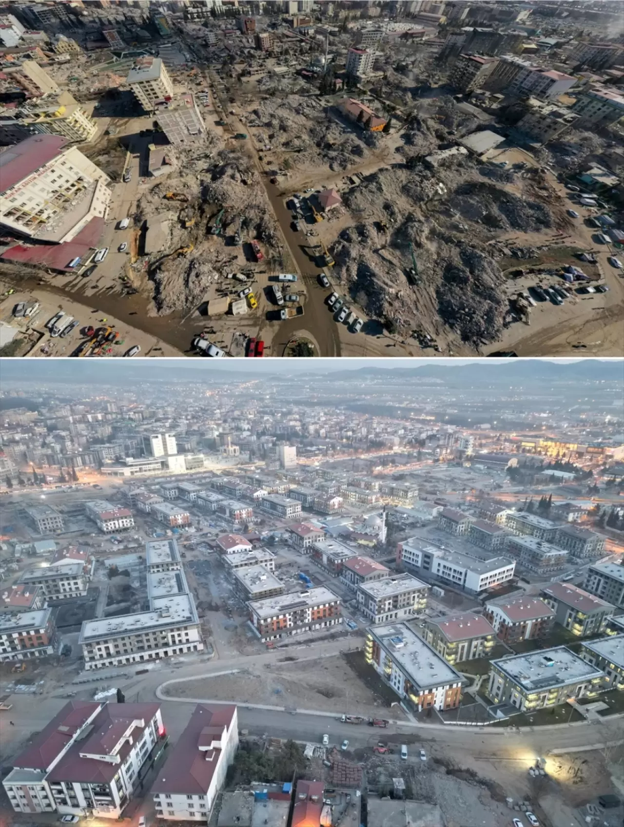 Kahramanmaraş, Hatay, Adıyaman ve Malatya kent merkezlerinde, 6 Şubat 2023 depreminin ardından kaydedilen görüntüler ile 2024 ve 2025 yıllarında çekilen kareler karşılaştırıldı. Görüntüler, iki yıl içinde yaşanan değişimi gözler önüne serdi.