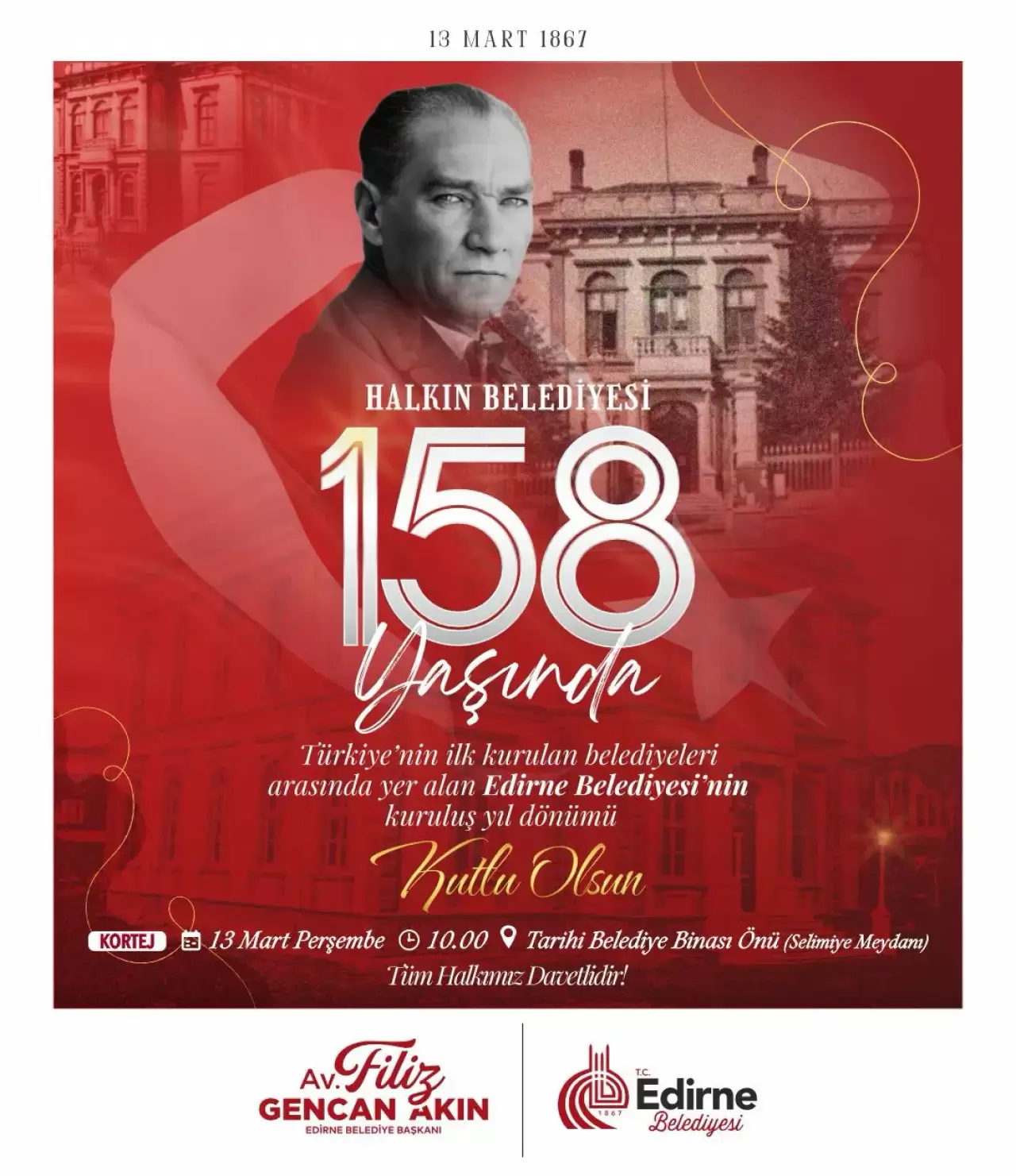 Edirne Belediyesi’nin 158. kuruluş yıl dönümü, Edirne’nin belediyecilik tarihinde önemli bir kilometre taşı olarak kutlanırken, tüm Edirneliler bu özel günde bir araya gelmeye davet edildi. Başkan Gencan Akın, geçmişten aldığı güçle geleceğe daha sağlam adımlarla yürümeyi, Edirne’yi daha da güzelleştirmeyi hedeflediklerini ifade etti.