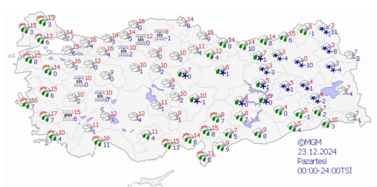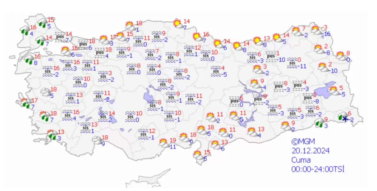 Sabah ve gece saatlerinde Marmara ile iç ve doğu bölgelerde pus ve yer yer sis görülebilir.