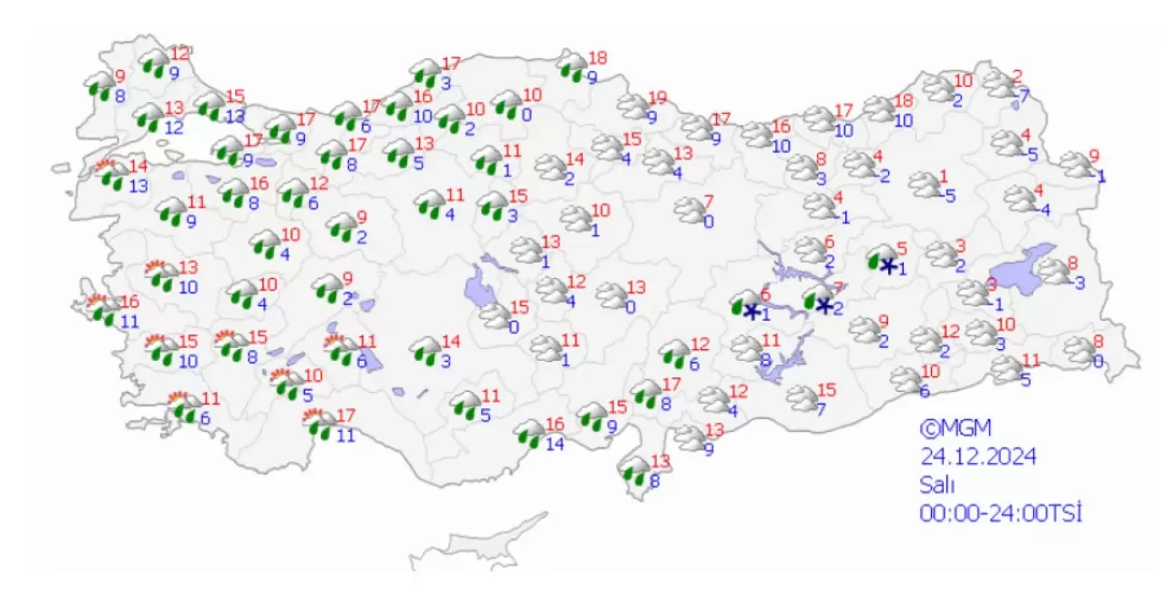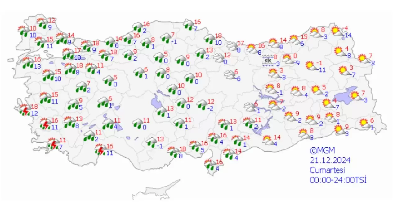 Bugün ülke genelinde parçalı ve çok bulutlu bir hava bekleniyor. Marmara'nın batısı, Ege, Bursa, Hakkari, Şırnak çevreleri ile Antalya'nın doğu ilçelerinde yağış bekleniyor. Yağışlar: