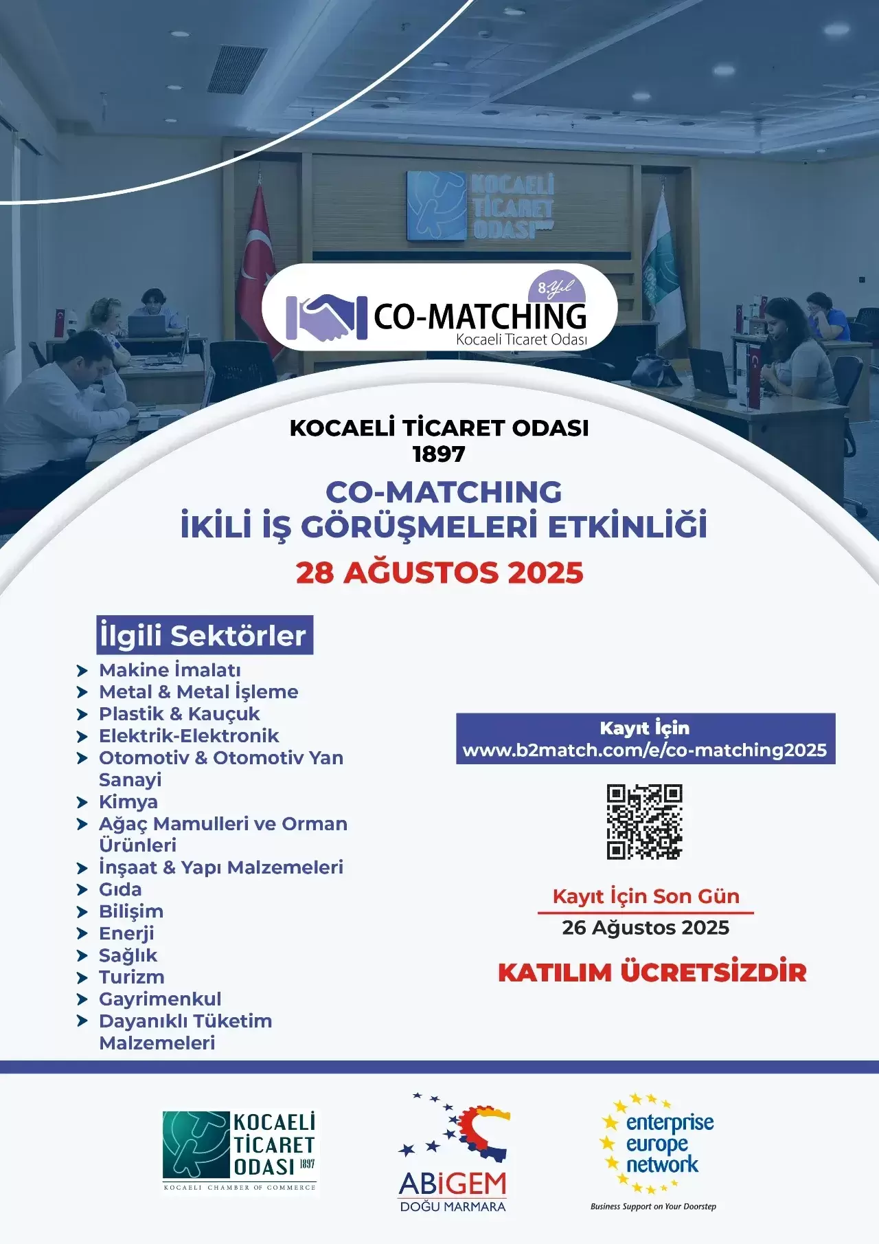 Co-Matching İkili İş Görüşmeleri Etkinliği'ne katılmak isteyen firmalar, 26 Ağustos 2025 tarihine kadar https://www.b2match.com/e/co-matching2025 adresi üzerinden kayıt yaptırarak yerlerini alabilirler. Kayıt yapan katılımcılar, çevrim içi platformda birbirleriyle görüşmeler yaparak iş fırsatlarını değerlendirebilecekler.