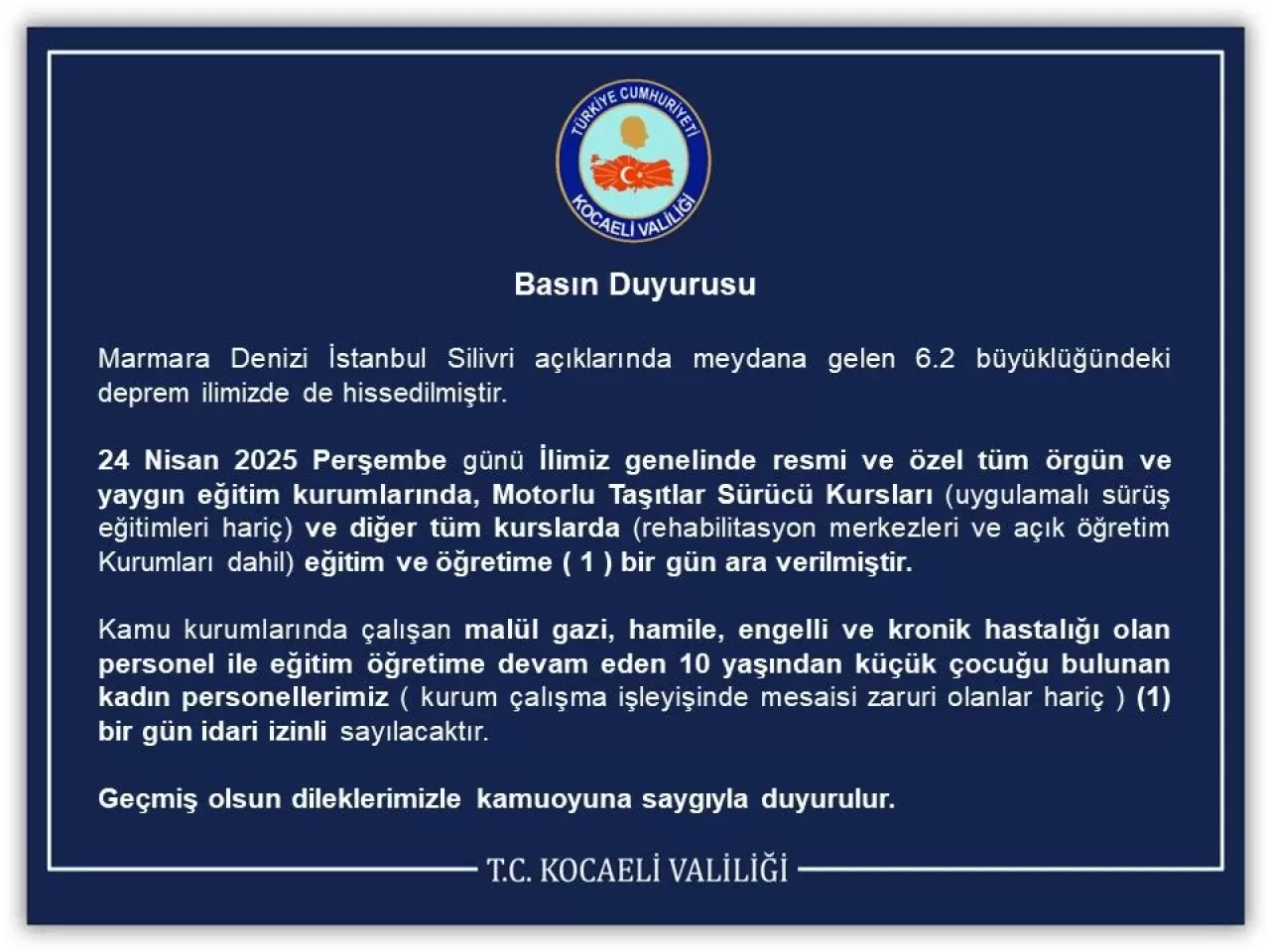 24 Nisan 2025 Perşembe günü, Marmara Denizi Silivri açıklarında meydana gelen 6.2 büyüklüğündeki deprem, Kocaeli'nde de şiddetli şekilde hissedildi. Depremin ardından Kocaeli Valiliği, eğitime 1 gün ara verilmesi kararını aldı.