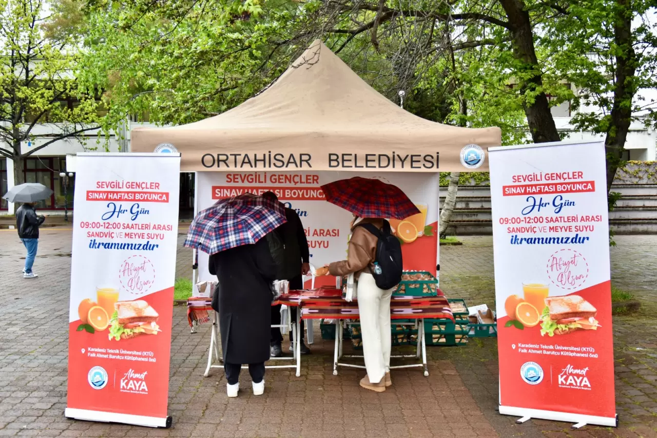 Ortahisar Belediyesi Sosyal Yardım İşleri Müdürlüğü tarafından Faik Ahmet Barutçu Kütüphanesi önünde kurulan stantta öğrencilere sandviç ve meyve suyu ikramı yapılıyor. Sınav haftası boyunca her gün saat 09.00 ile 12.00 arasında hizmet veren stanttan tüm öğrenciler faydalanabiliyor.