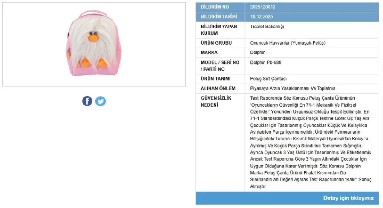 Ticaret Bakanlığı, Dolphin markalı pelüş sırt çantasının halk sağlığı açısından risk taşıdığını belirleyerek satışını durdurdu ve toplatma kararı aldı.