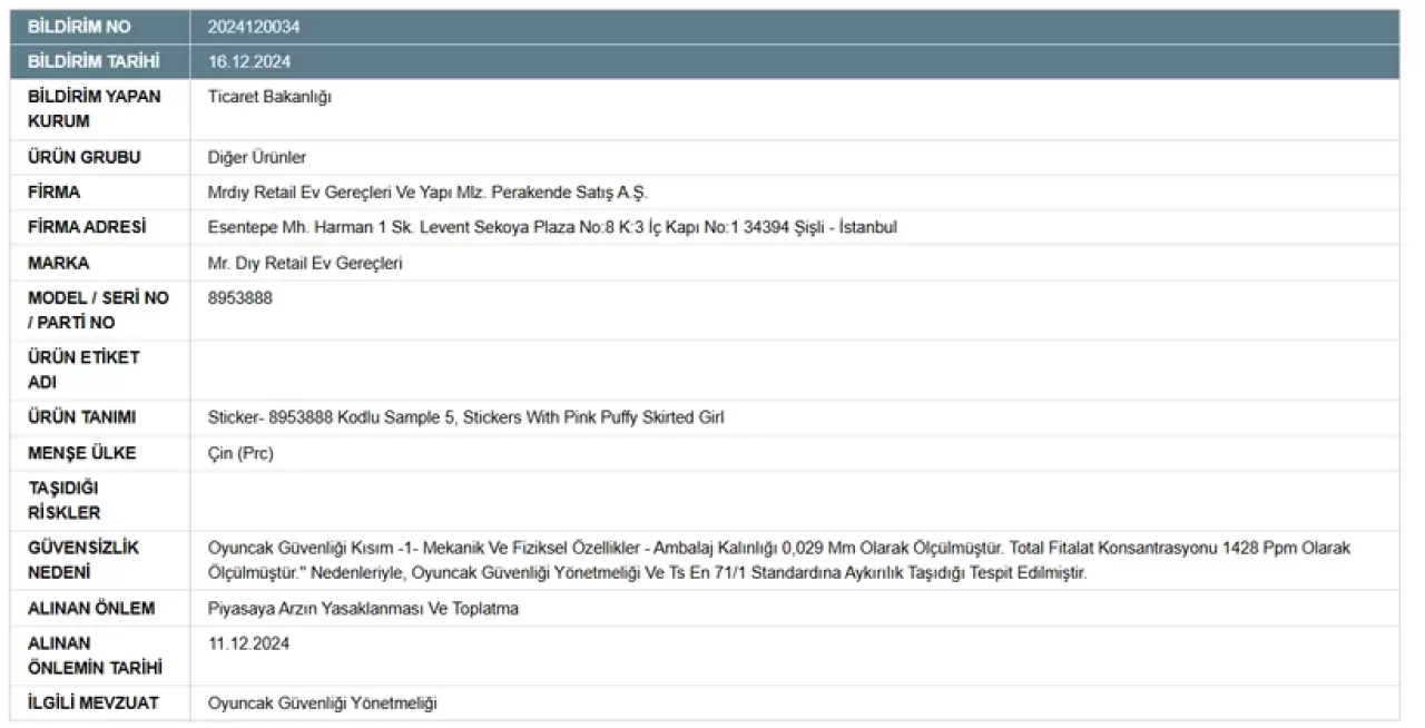 Bakanlık, Güvensiz Ürün Bilgi Sistemi (GÜBİS) üzerinden yaptığı açıklamada, "Fitalat" limit değerinin üzerinde tespit edildiği ve "Oyuncak Güvenliği Yönetmeliği" standartlarına aykırılık taşıdığı belirlenen ürünlerin piyasadan toplatıldığını duyurdu. Açıklamaya göre, bu ürünler kırtasiye ve oyuncakçılarda satılan "Mr. Dıy" marka iki farklı sticker (etiket) seti.