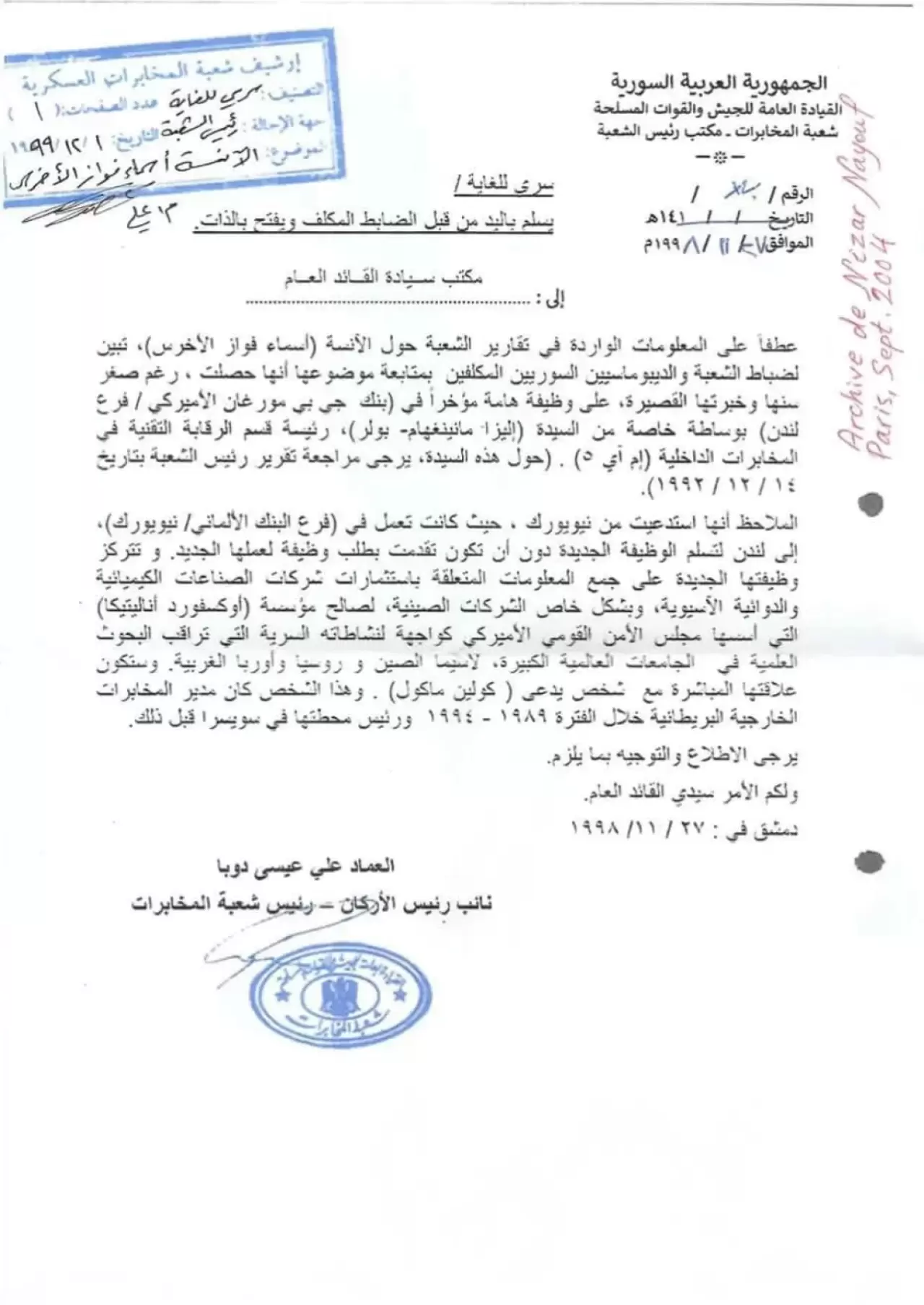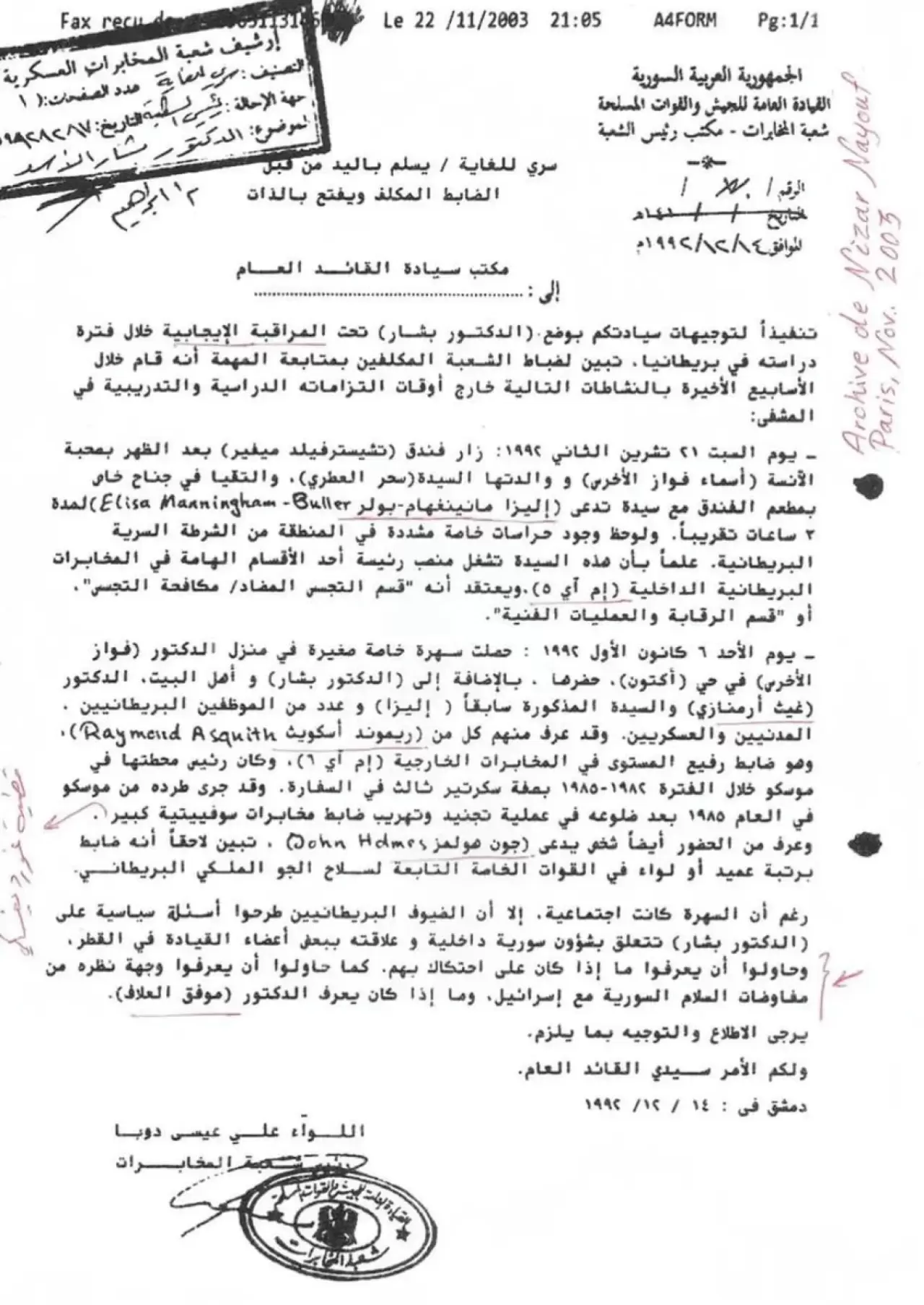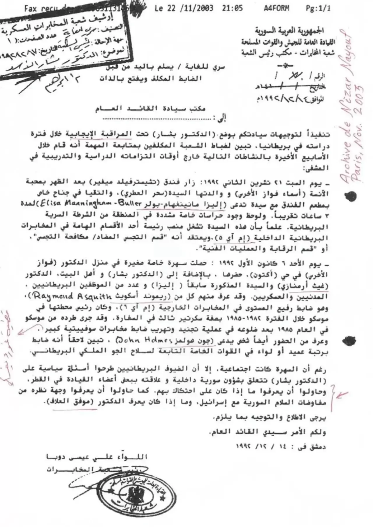 UK Declassified tarafından yayınlanan belgeler, Esma Esad’ın 1994 yılında İngiltere’de istihbarat faaliyetlerinde bulunduğunu ve MI5 yetkilileriyle görüşmeler yaptığını gösteriyor. Belgelere göre, Esma Esad, dönemin MI5 üst düzey yetkilisi Eliza Manningham-Buller ile Chesterfield Mayfair Otel’de özel bir görüşme gerçekleştirdi.