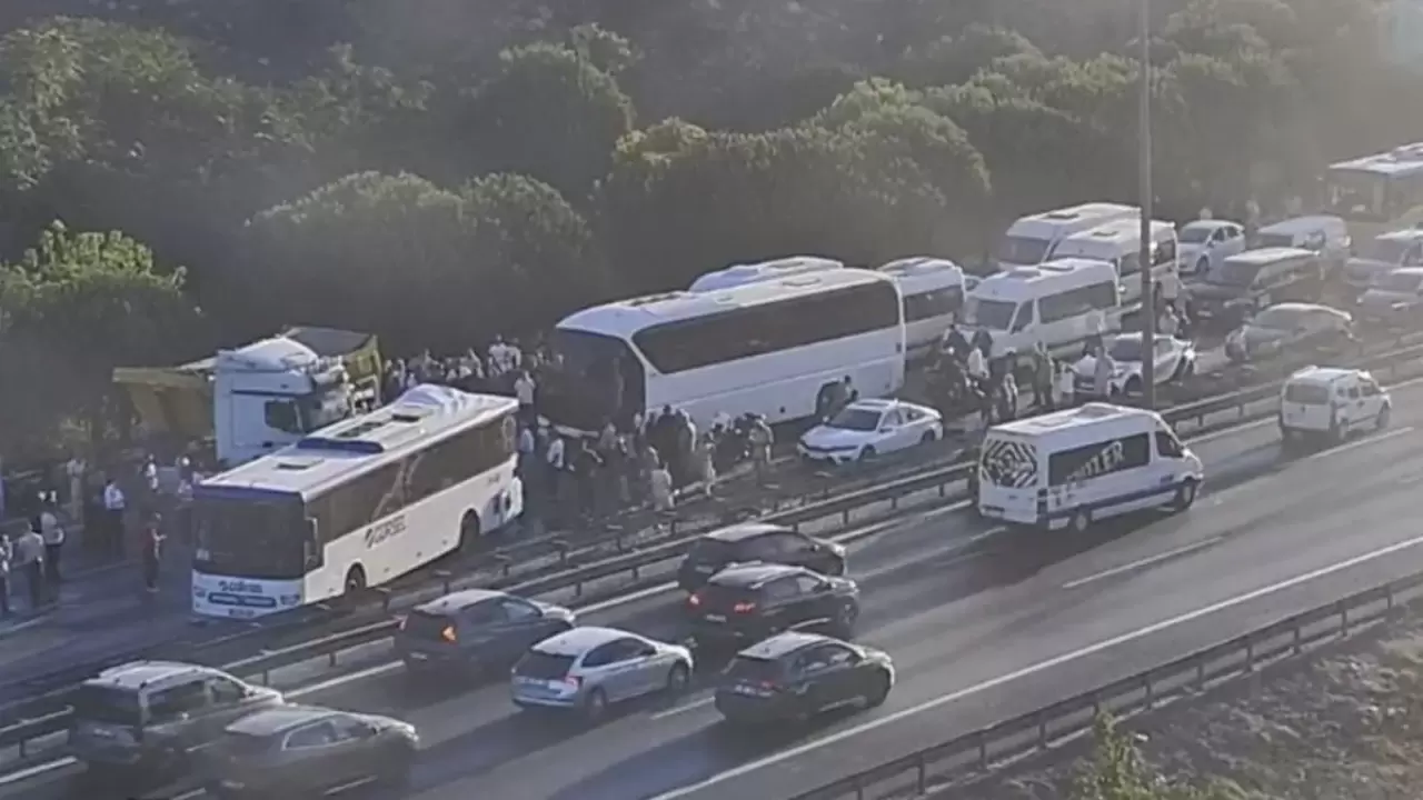 TEM Otoyolu Halkalı mevkiinde kamyon ve otobüslerin karıştığı zincirleme kazada 1 kişi hayatını kaybetti, 21 kişi yaralandı.