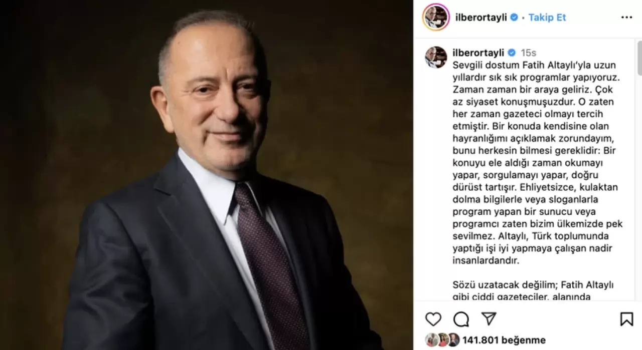 Gazeteci Fatih Altaylı'nın Cumhurbaşkanı Recep Tayyip Erdoğan'ı tehdit ettiği iddiasıyla tutuklanmasının ardından, yakın arkadaşı olan tarihçi Prof. Dr. İlber Ortaylı'dan dikkat çeken bir mesaj geldi. Ortaylı, sosyal medya hesabından yaptığı açıklamada, Altaylı'nın gazeteciliğini överek, "Türk toplumunda yaptığı işi iyi yapmaya çalışan nadir insanlardandır" dedi.