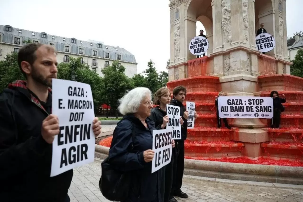 Fransa'nın başkenti Paris'te, Gazze'deki insani krize dikkat çekmek amacıyla büyük bir protesto düzenlendi. Sivil toplum kuruluşlarının (STK) katılımıyla gerçekleşen eylem, "Gazze'deki kan gölü durdurulsun" çağrısıyla yapıldı. Eylemciler, Paris'in 1. bölgesinde yer alan Masumlar Çeşmesi'ne kırmızı gıda boyası dökerek, Gazze’deki şiddeti protesto etti.