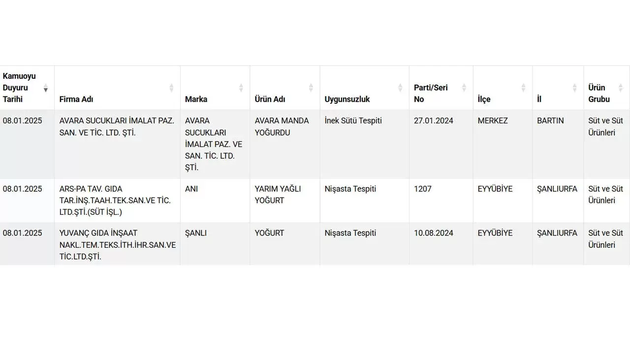 Tarım ve Orman Bakanlığı, 8 Ocak 2025 tarihinde güncellediği "Taklit veya Tağşiş Yapılan Gıdalar" listesinde, süt ve süt ürünleri kategorisinde faaliyet gösteren üç firmayı ifşa etti. Bu firmaların ürettikleri yoğurtlarda yapılan analizlerde nişasta tespit edildi.