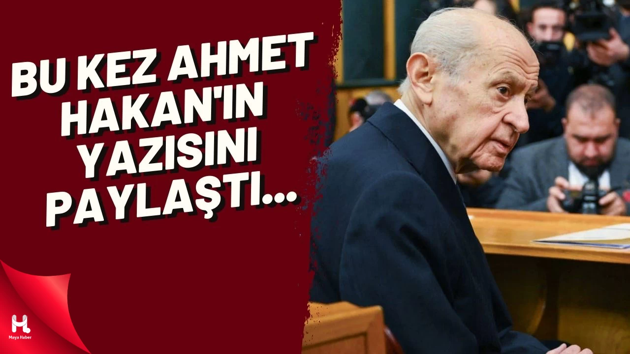 MHP Genel Başkanı Devlet Bahçeli'nin, İstanbul Büyükşehir Belediye (İBB) Başkanı Ekrem İmamoğlu hakkında yaptığı açıklamaların ardından, partililerden dikkat çeken bir adım daha geldi. MHP'nin etkili isimleri, Hürriyet gazetesi Genel Yayın Yönetmeni Ahmet Hakan'ın Bahçeli'ye dair yazısını sosyal medyada paylaştı. Hakan'ın yazısı, Bahçeli'yi öven ifadelerle doluydu.