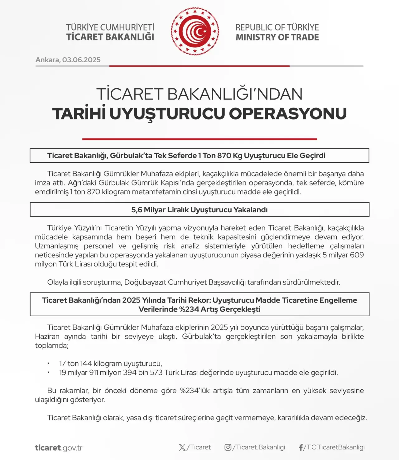 Ticaret Bakanlığı, Gümrük Muhafaza ekiplerinin Ağrı'daki Gürbulak Kapısı'nda gerçekleştirdiği büyük uyuşturucu operasyonuyla, piyasa değeri 5.6 milyar TL'yi bulan 1 ton 870 kilogram metamfetamin ele geçirdi.