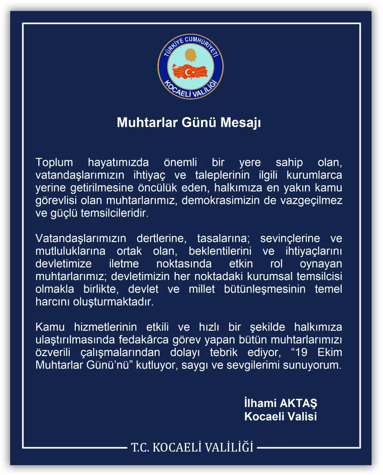 Kocaeli Valisi İlhami Aktaş, 19 Ekim Muhtarlar Günü dolayısıyla yayımladığı mesajda, muhtarların toplum yaşamındaki önemine dikkat çekerek tüm muhtarların gününü kutladı.