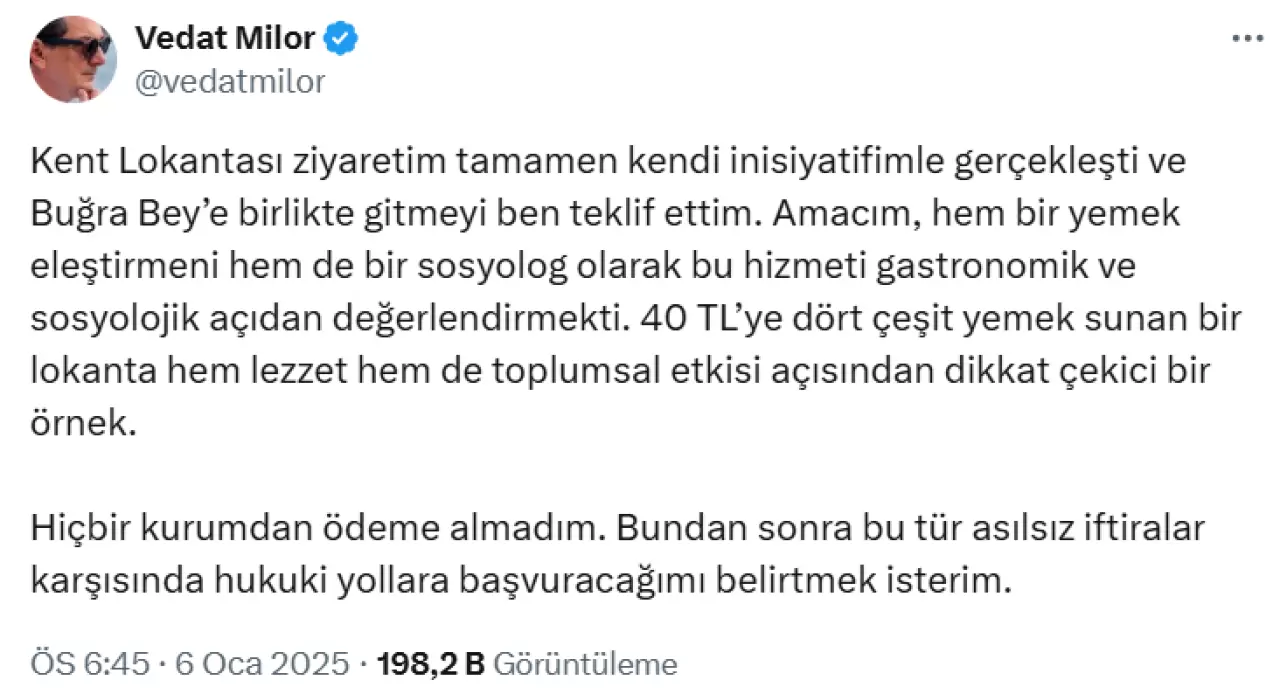 Vedat Milor'den Kent Lokantası Tepkisi: "Hukuki Yollara Başvuracağım"
