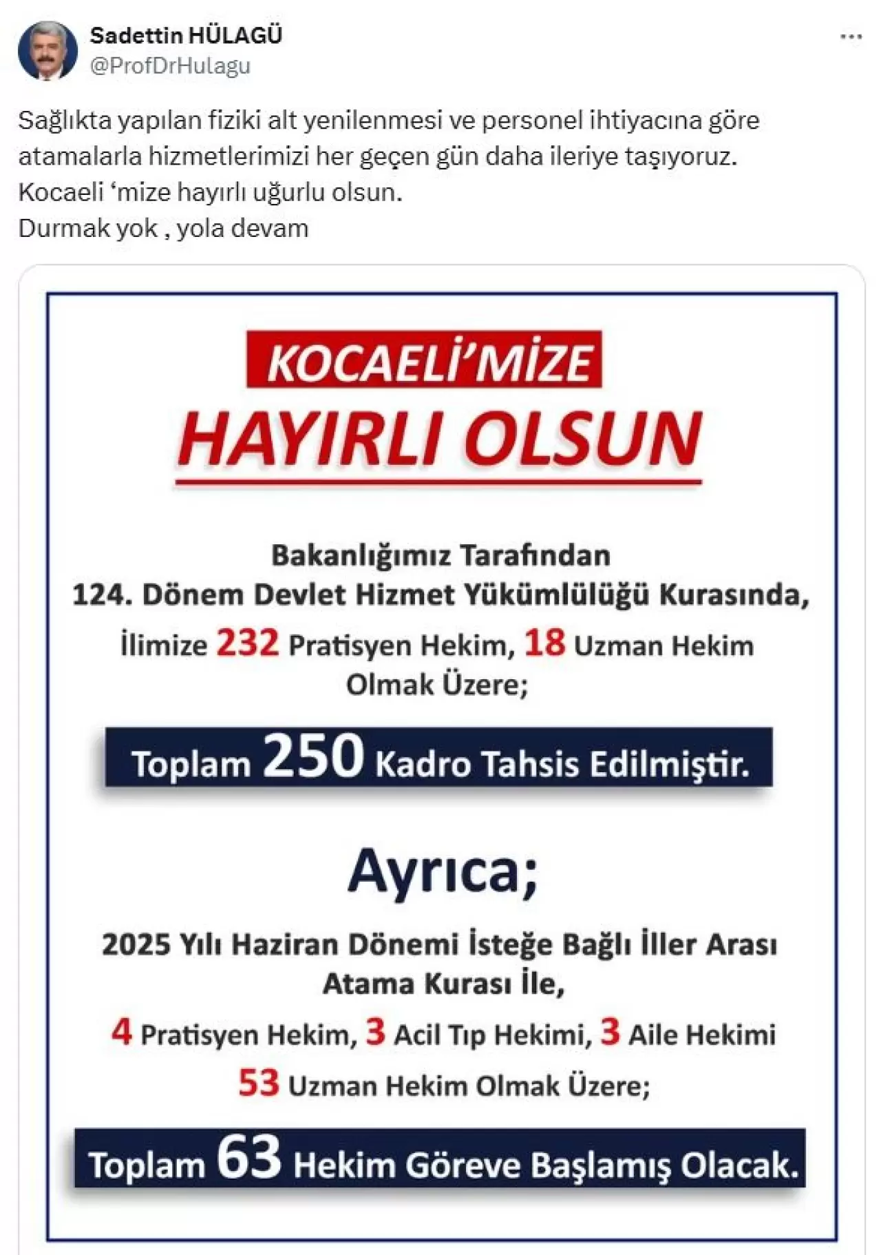 Sadettin Hülagü, 2025 yılı haziran dönemi isteğe bağlı iller arası atama kurası ile 63 hekimin göreve başlayacağını da açıkladı. Bu atamalarla birlikte 4 pratisyen hekim, 3 acil tıp hekimi, 3 aile hekimi ve 53 uzman hekim Kocaeli’de görev yapacak.