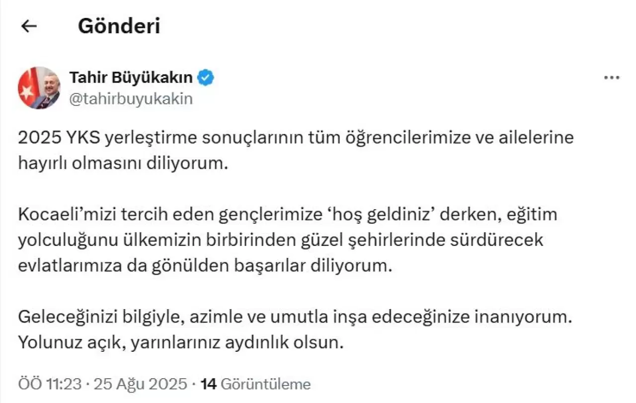 Kocaeli Büyükşehir Belediye Başkanı Doç. Dr. Tahir Büyükakın, yerleştirme sonuçlarının açıklanmasının ardından üniversite kazanan gençlere tebrik mesajı yayınladı.