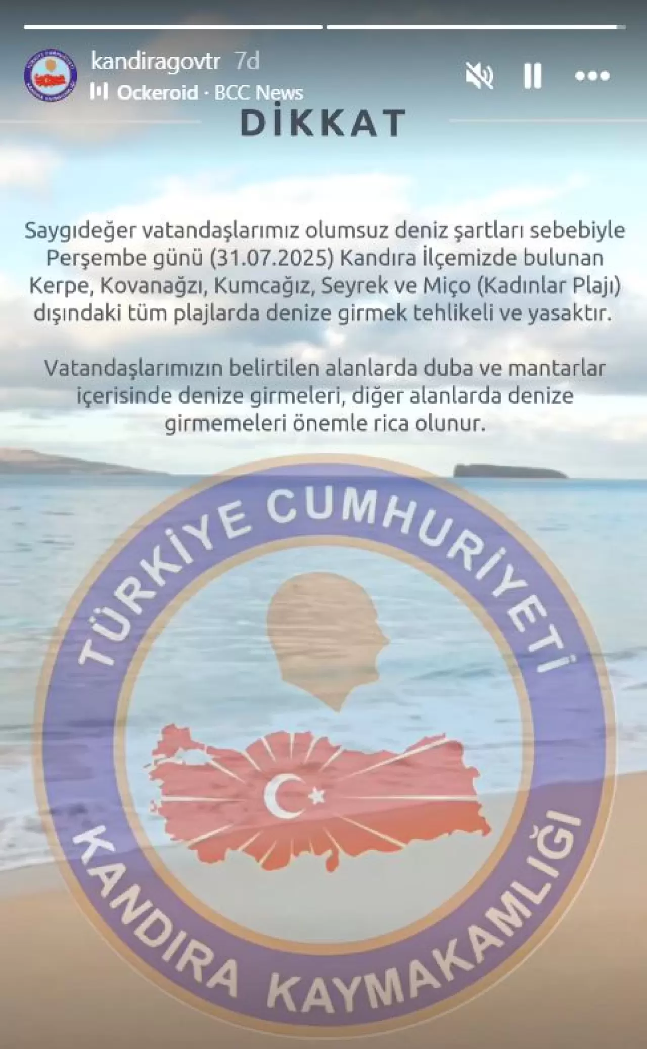 “Saygıdeğer vatandaşlarımız, olumsuz deniz şartları sebebiyle Perşembe günü (31.07.2025) Kandıra İlçemizde bulunan Kerpe, Kovanağzı, Kumcağız, Seyrek ve Miço (Kadınlar Plajı) dışındaki tüm plajlarda denize girmek tehlikeli ve yasaktır. Vatandaşlarımızın belirtilen alanlarda duba ve mantarlar içerisinde denize girmeleri, diğer alanlarda denize girmemeleri önemle rica olunur.”