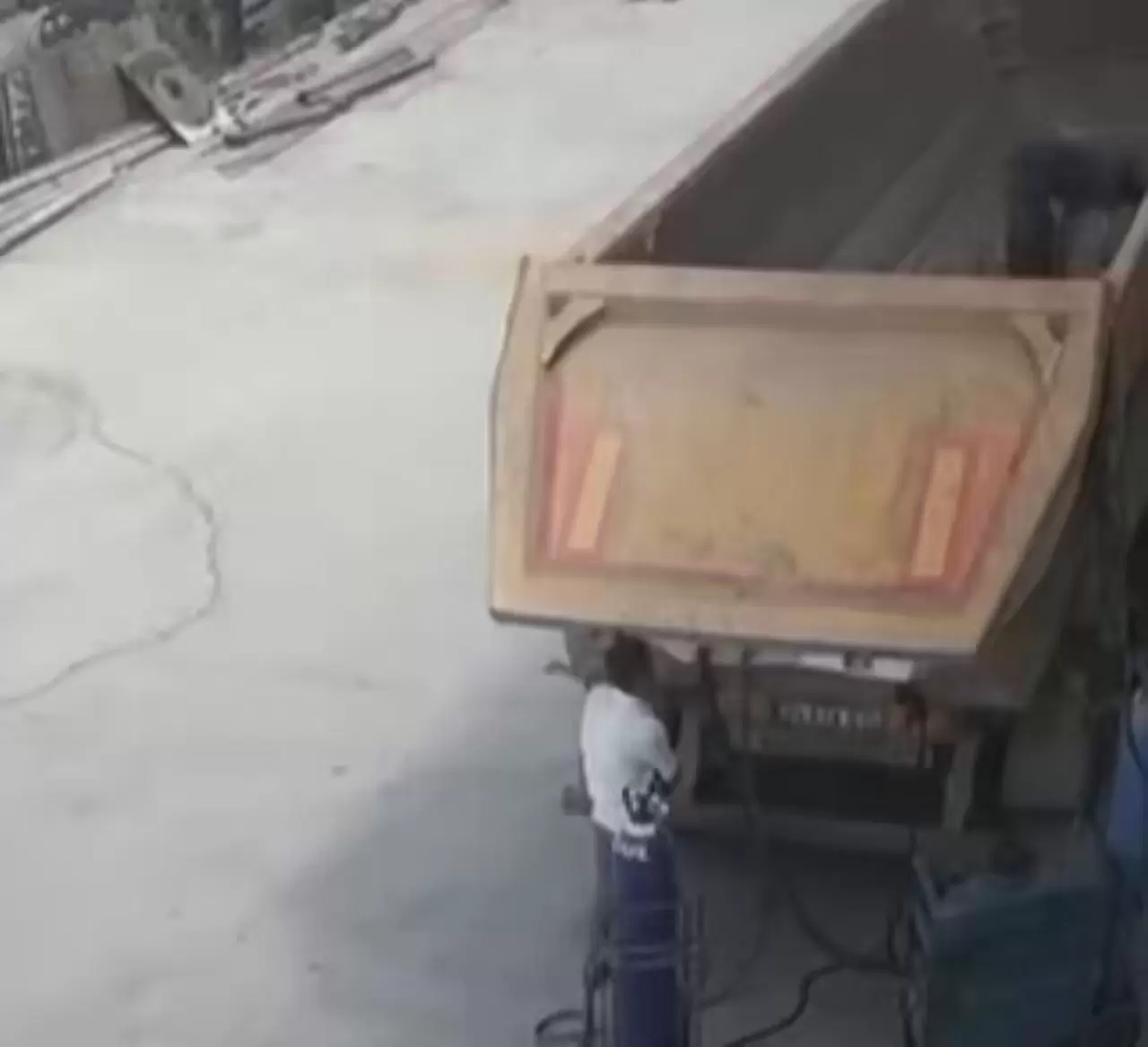 Kocaeli Gebze'de, tamir için götürdüğü hafriyat kamyonunun damper kapağının başına çarpması sonucu hayatını kaybeden Mevlüt Şafak'ın ölüm anı kameraya yansıdı.