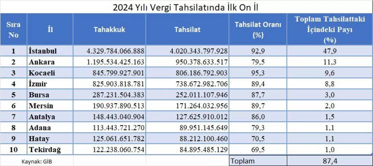 Türkiye Genelinde İlk 10 İl %87,4 Tahsilat Payına Sahip