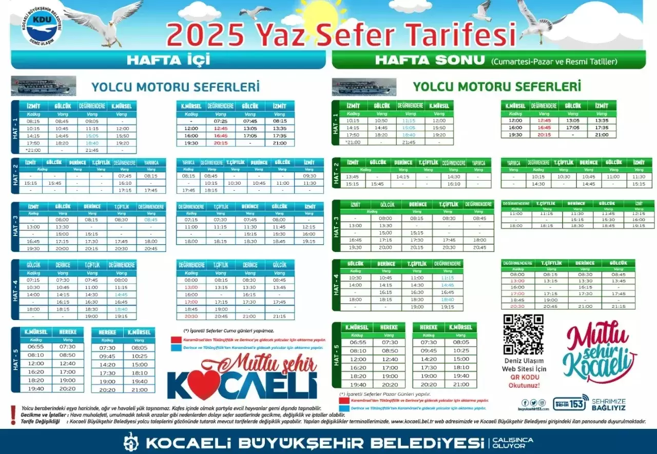 Büyükşehir Belediyesi Ulaşım Dairesi Başkanlığı’na bağlı Deniz Ulaşım Şube Müdürlüğü, yaz tarifesini hayata geçiriyor. 5 farklı hattın ve 9 yolcu iskelesinin aktif olduğu yaz tarifesiyle, günlük 110 sefer yapılacak. Yenilenen hatlar ve sefer saatleri, Kocaeli'nin ulaşım sistemine önemli bir katkı sağlayacak.