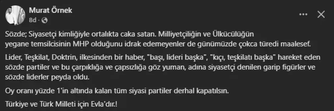 MHP İzmit İlçe Yöneticisi Murat Örnek, sosyal medya üzerinden yaptığı dikkat çekici paylaşımda, Türkiye'nin siyasi istikrarı ve milli menfaatler için yüzde 1’in altında oy alan partilerin kapatılması gerektiğini belirtti. Örnek, "Bu Türkiye ve Türk milleti için en hayırlı olandır" diyerek, güçlü ve istikrarlı bir siyasi yapının önemine dikkat çekti.