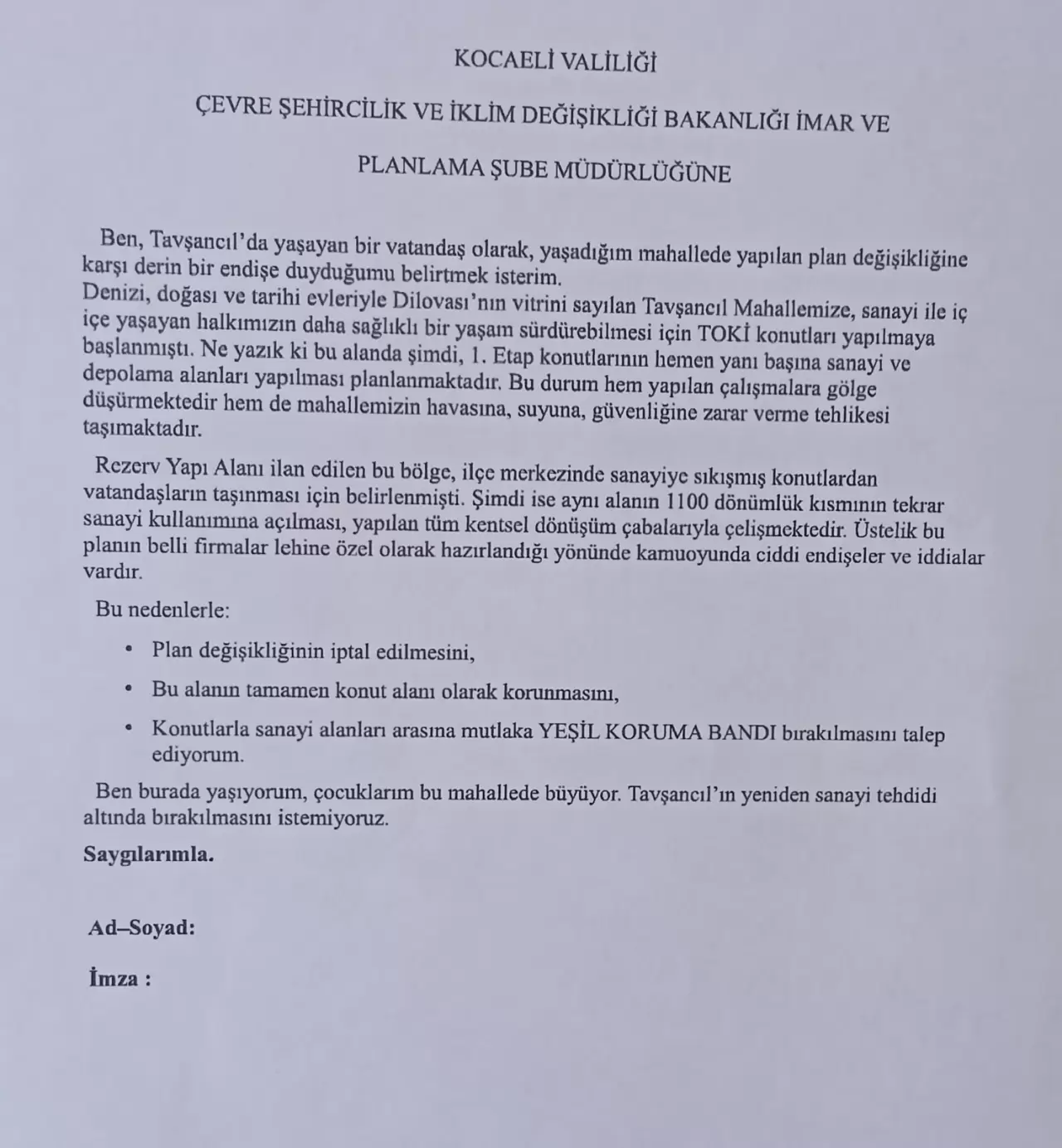 Kocaeli’nin Dilovası ilçesine bağlı Tavşancıl Mahallesi’nde 110 dönümlük alanın sanayi ve depolama alanı olarak ayrılmasına karşı mahalle halkı harekete geçti. Mahalle muhtarlığında başlatılan imza kampanyasıyla birlikte, vatandaşlar verimli tarım arazilerine sanayi tesisi yapılmasına karşı çıkıyor.