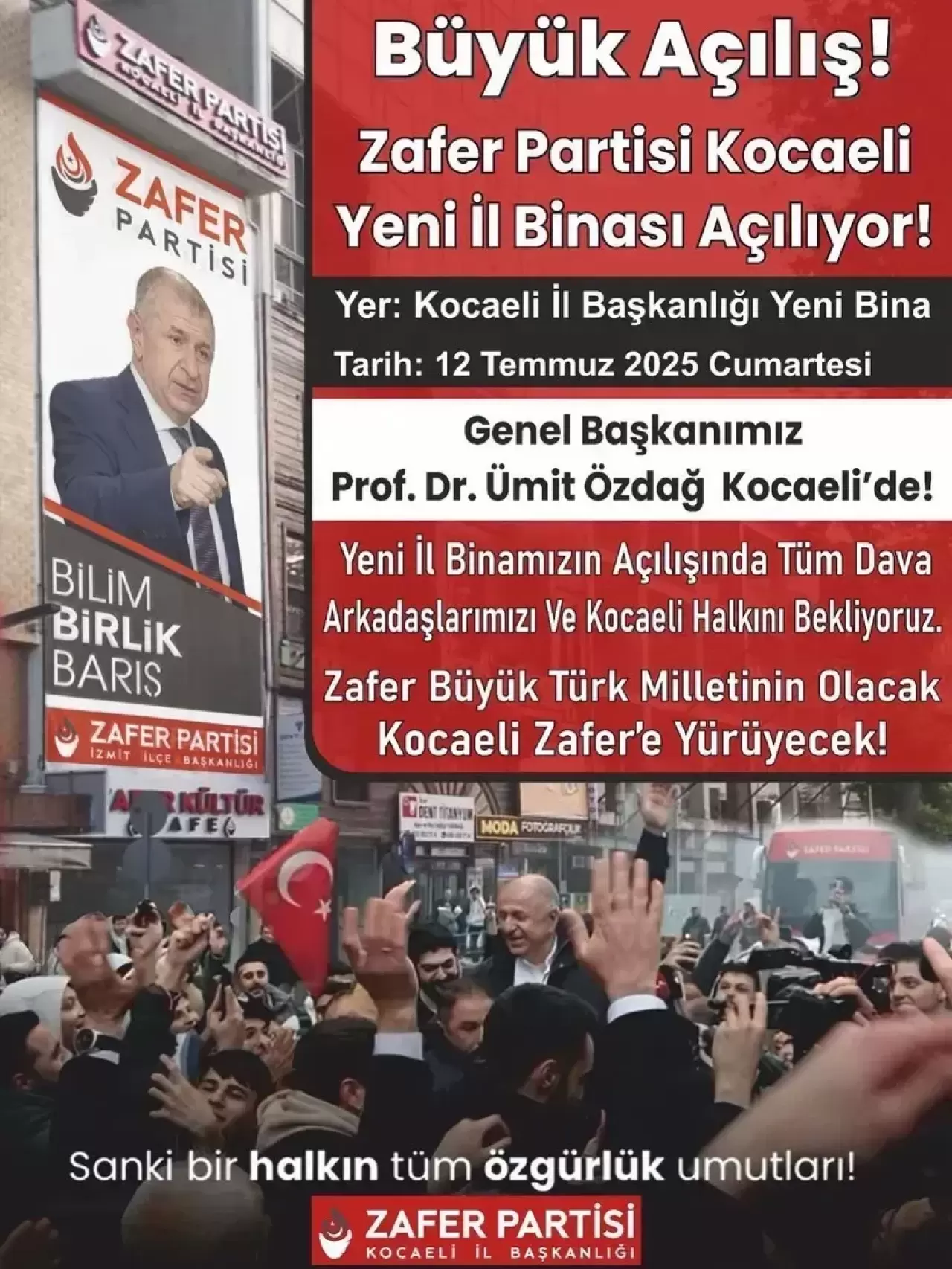 Zafer Partisi, 12 Temmuz’da Kocaeli’deki yeni il binasının açılışını gerçekleştirecek. Parti Genel Başkanı Ümit Özdağ’ın katılımıyla yapılacak olan tören, Zafer Partisi’nin Kocaeli’deki siyasi gücünü pekiştirmeyi amaçlayan önemli bir adım olarak görülüyor. Parti yetkilileri, bu açılışın Zafer Partisi'nin bölgedeki varlığını daha da güçlendireceğini ve yerel siyasetteki etkisini artıracağını ifade etti.