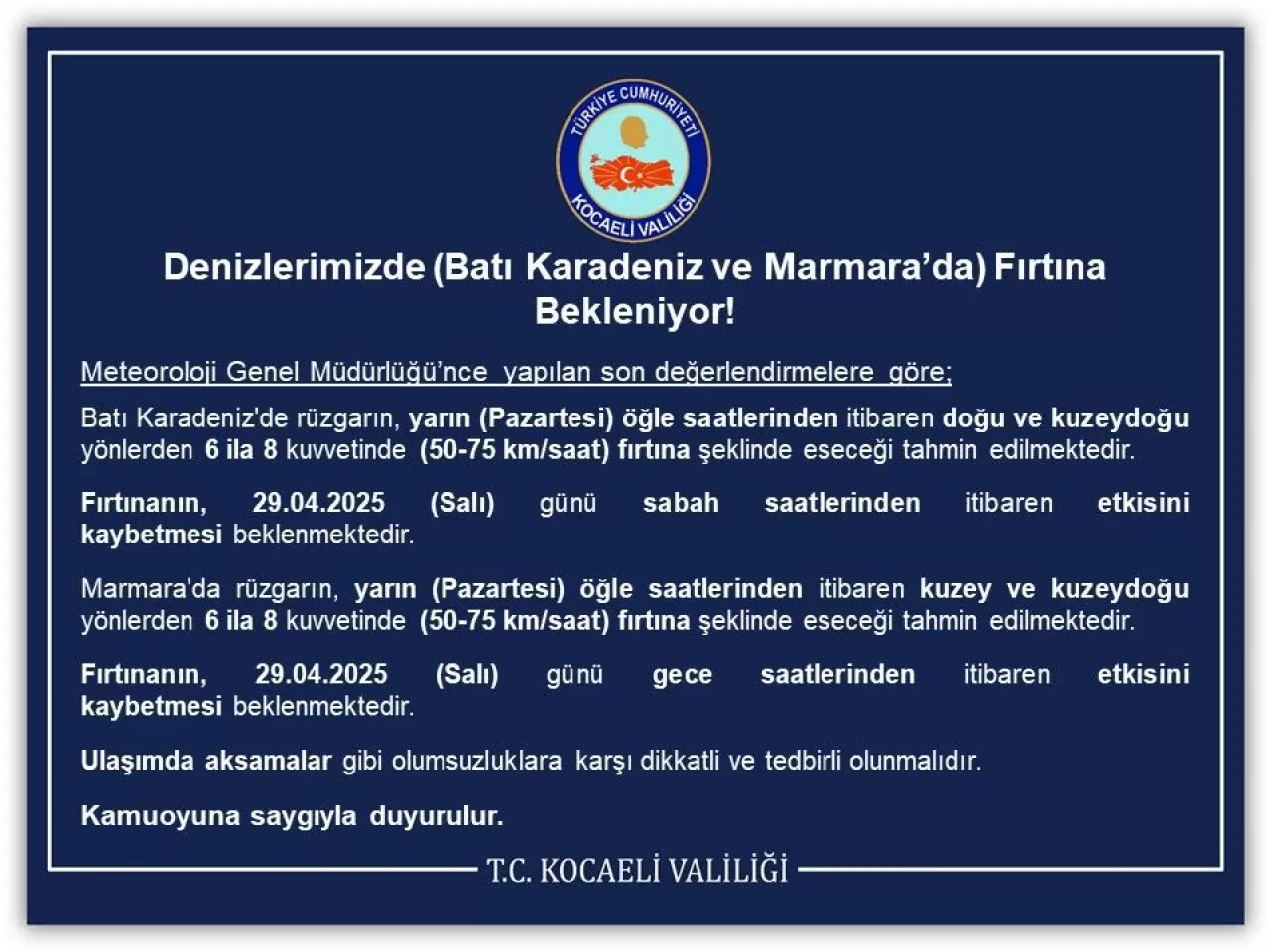 Kocaeli Valiliği, kentte etkili olması beklenen fırtına nedeniyle vatandaşları uyardı. Meteoroloji Genel Müdürlüğü tarafından yapılan açıklamalara göre, Pazartesi öğle saatlerinden Salı gününe kadar Batı Karadeniz'de ve Marmara'da 6 ila 8 kuvvetinde (50-75 km/saat) doğu ve kuzeydoğu yönlerden esmesi beklenen rüzgarın fırtına şeklinde etkili olacağı tahmin ediliyor.