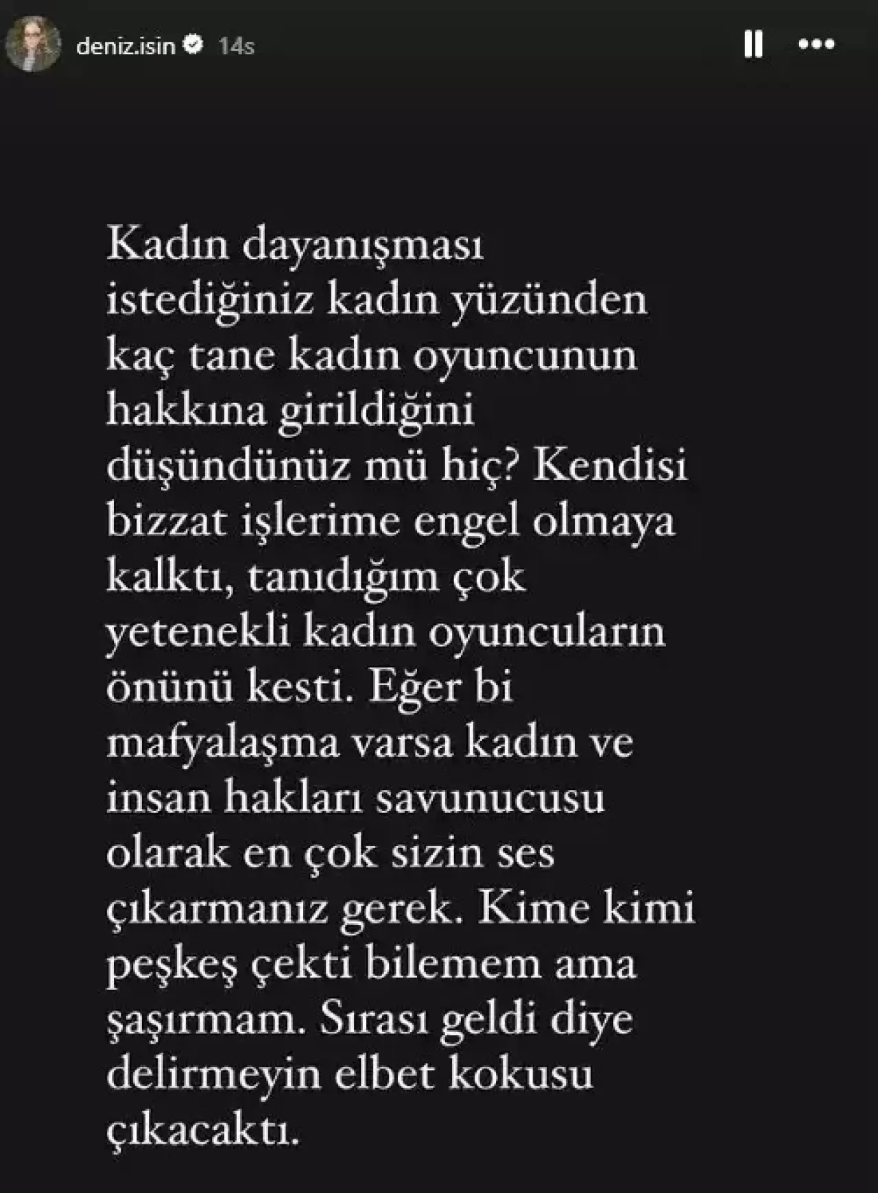 "Kadın dayanışması istediğiniz kadın yüzünden kaç tane kadın oyuncunun hakkına girildiğini düşündünüz mü hiç? Kendisi bizzat işlerime engel olmaya kalktı, tanıdığım çok yetenekli kadın oyuncuların önünü kesti. Eğer bir mafyalaşma varsa, kadın ve insan hakları savunucusu olarak en çok sizin ses çıkarmanız gerek. Kime kimi peşkeş çekti bilemem ama şaşırmam. Sırası geldi diye delirmeyin, elbet kokusu çıkacaktı."