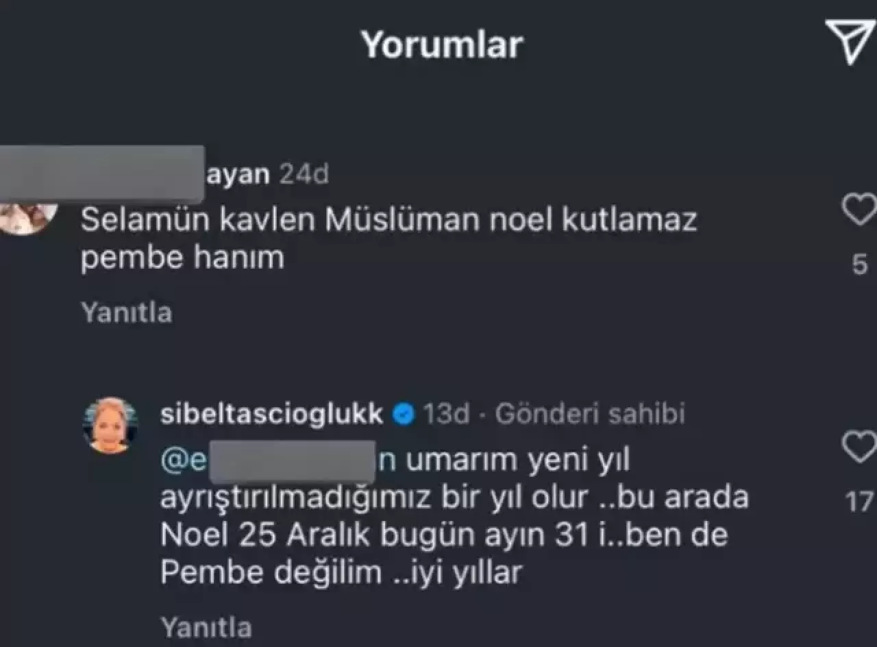 Paylaşımına bir takipçisi, “Selamün kavlen Müslüman Noel kutlamaz Pembe Hanım” şeklinde bir yorum yaptı. Sibel Taşçıoğlu, bu yorumu yanıtsız bırakmadı ve dikkat çeken bir cevap verdi: