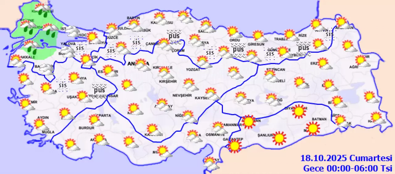 Diğer bölgelerde havanın az bulutlu ve açık geçeceği tahmin edilirken, Marmara’nın güneyi, İç Ege ve Karadeniz’in iç kesimlerinde sabah ve gece saatlerinde pus ve yer yer sis görüleceği bildirildi.