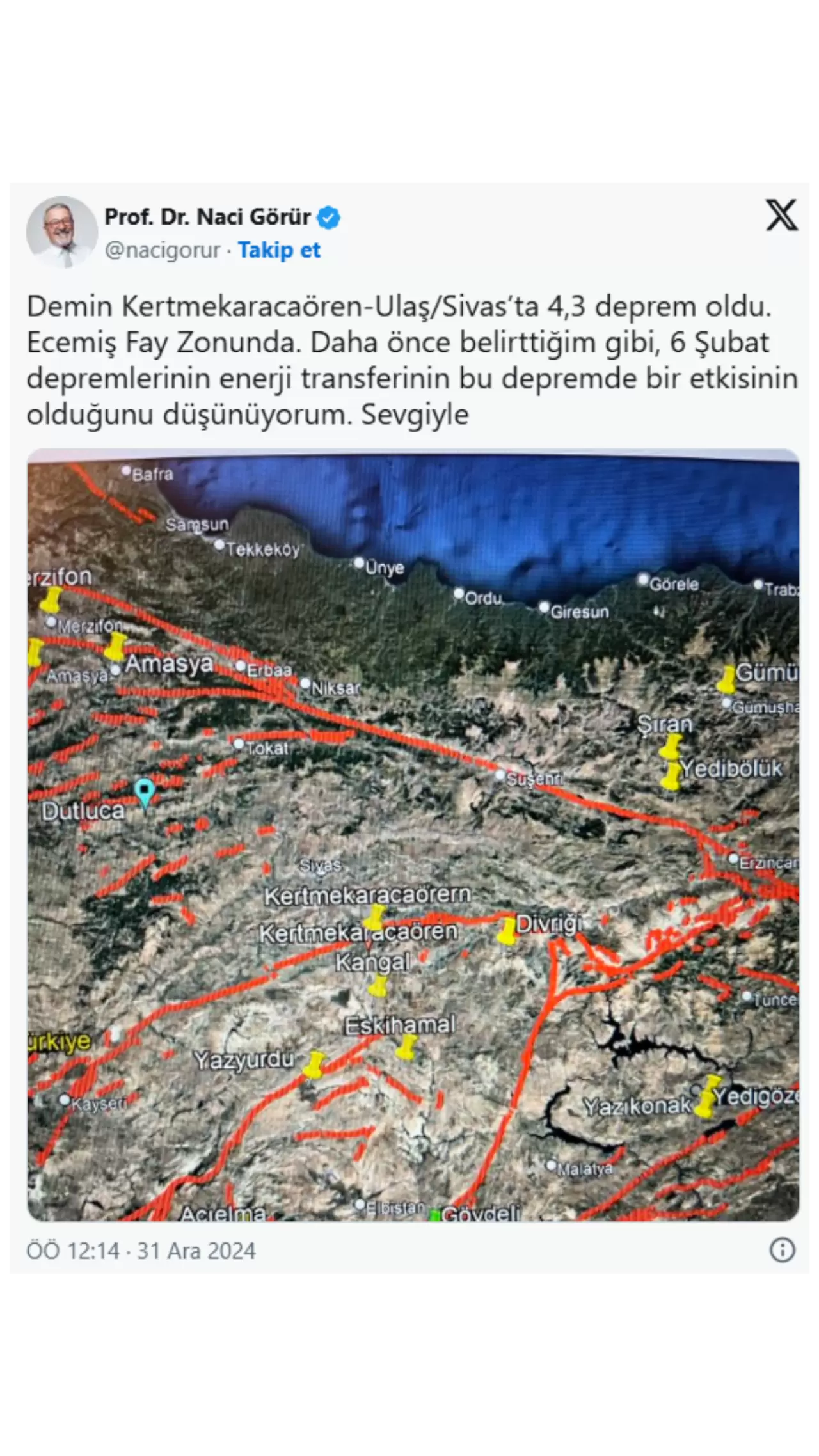 "Demin Kertmekaracaören-Ulaş/Sivas’ta 4.3 büyüklüğünde bir deprem oldu. Ecemiş Fay Zonunda. Daha önce belirttiğim gibi, 6 Şubat depremlerinin enerji transferinin bu depremde bir etkisinin olduğunu düşünüyorum."