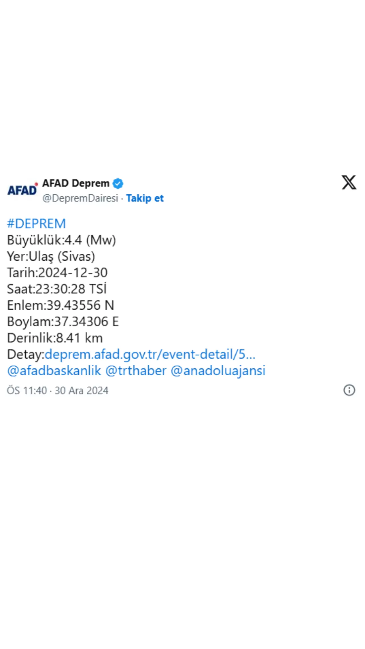 “Merkez üssü Ulaş ilçemiz olan 4.4 büyüklüğündeki depremden etkilenen tüm vatandaşlarımıza geçmiş olsun. Ekiplerimiz saha taraması çalışmalarına başlamıştır. Allah, ülkemizi tüm felaketlerden korusun.”