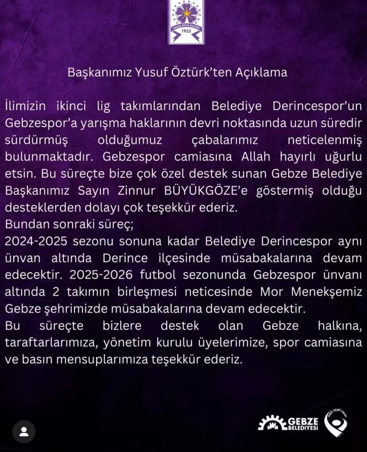 Gebzespor yönetimi, Belediye Derincespor’un yarışmacı haklarını 58 milyon TL karşılığında satın aldığını resmen açıkladı.