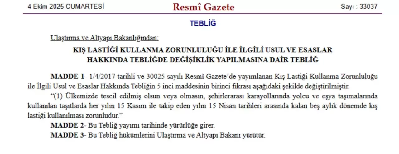 Daha önce 1 Aralık–1 Nisan tarihleri arasında uygulanan zorunluluk, yeni düzenlemeyle 15 Kasım–15 Nisan tarihleri arasında geçerli olacak. Böylece kış lastiği takma süresi 1 ay daha uzatılmış oldu.